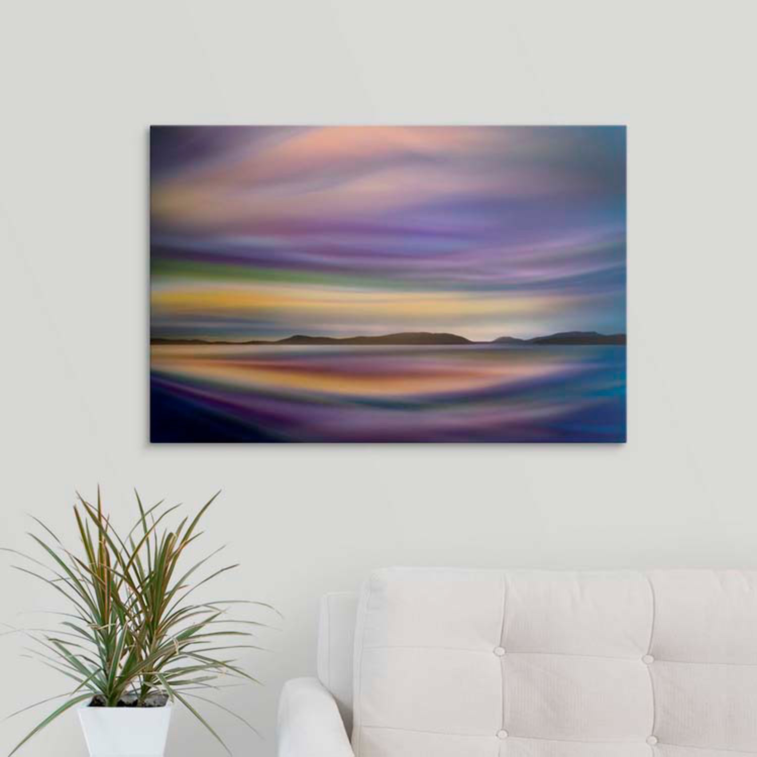 This proprietary canvas print of artist Ursula Abresch's Coastlines provides a classic and distinctive texture, while UV protectant archival inks produce a vibrant, scratch and fade resistant print. The finished canvas print is mounted to and wrapped around a sturdy yet lightweight board to protect against warping or loose, sagging prints. It is then finished with a closed matboard backing and includes pre-installed, ready-to-hang sawtooth hardware.