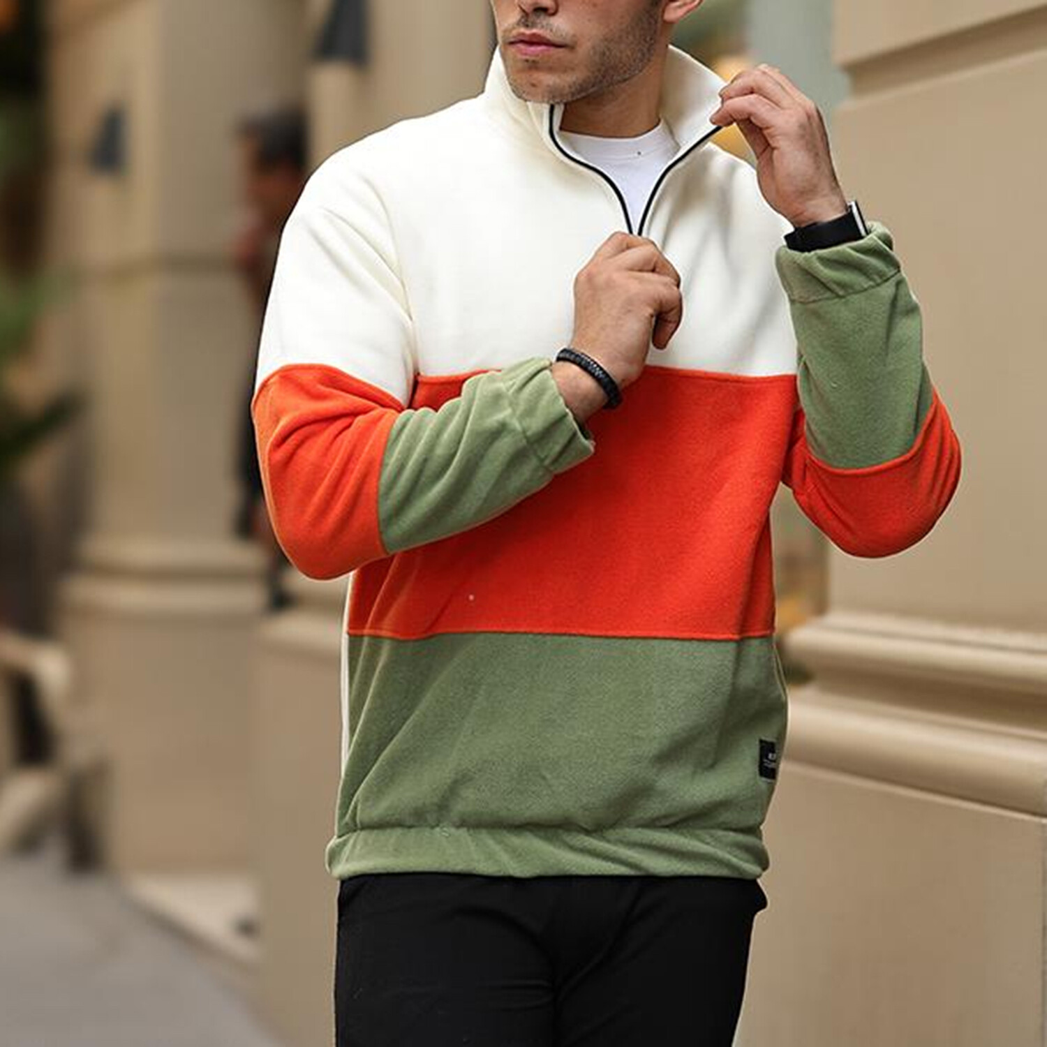 Blocked Half Zip Fleece Sweatshirt // Beige + Orange + Green