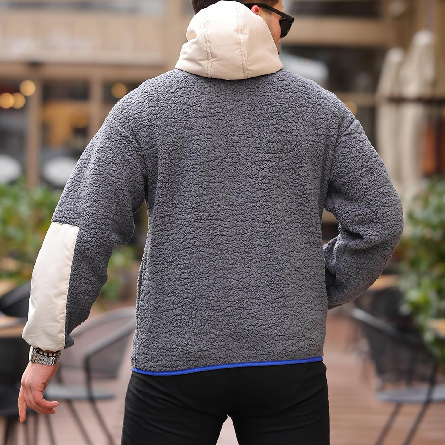 Hooded Kangaroo Pocket Half Zip Plush Sweatshirt // Gray + Blue