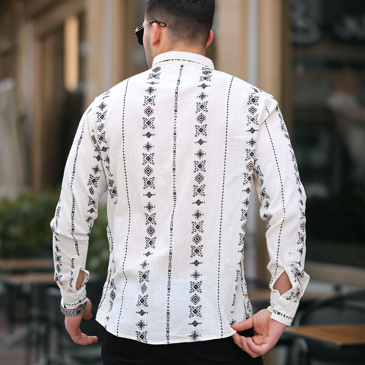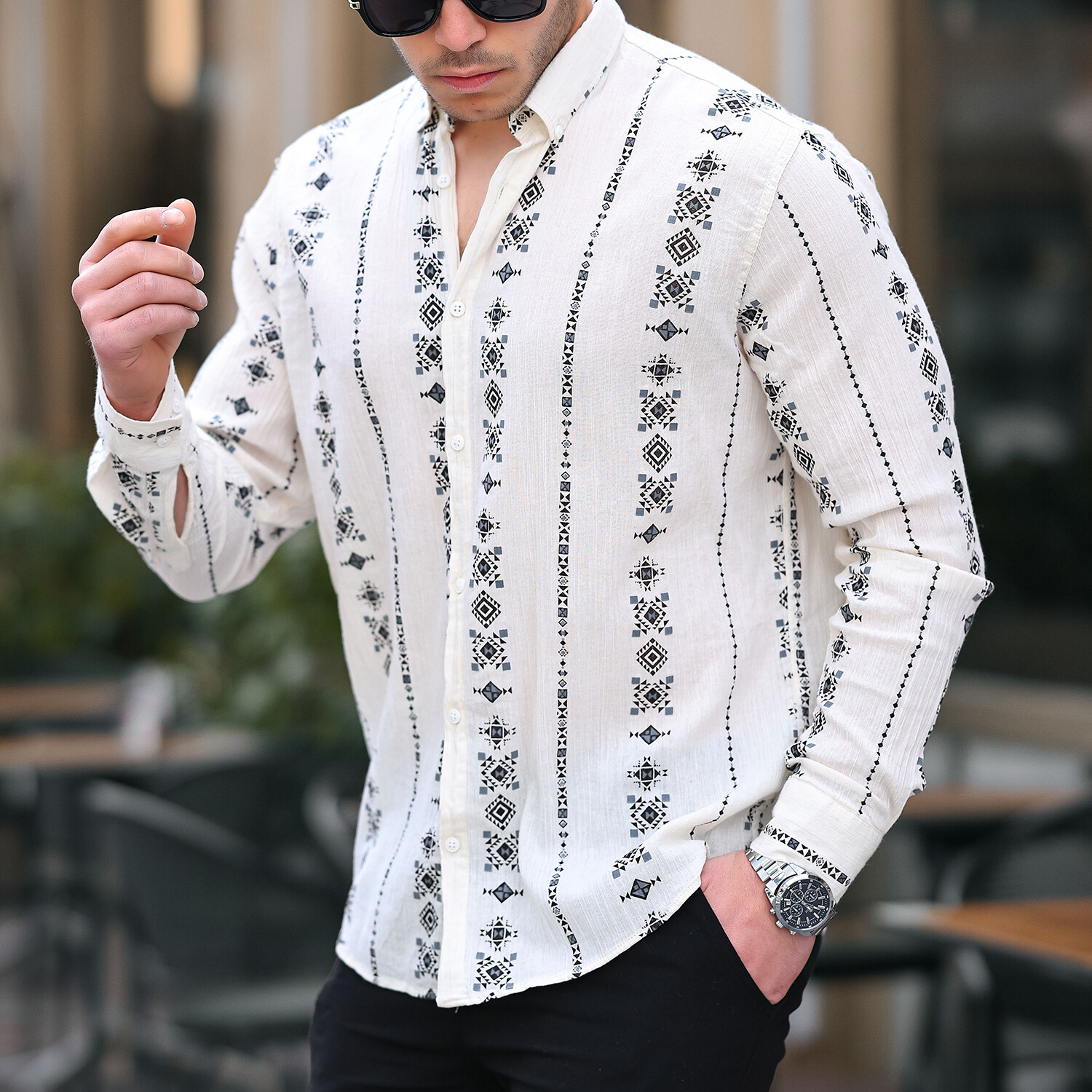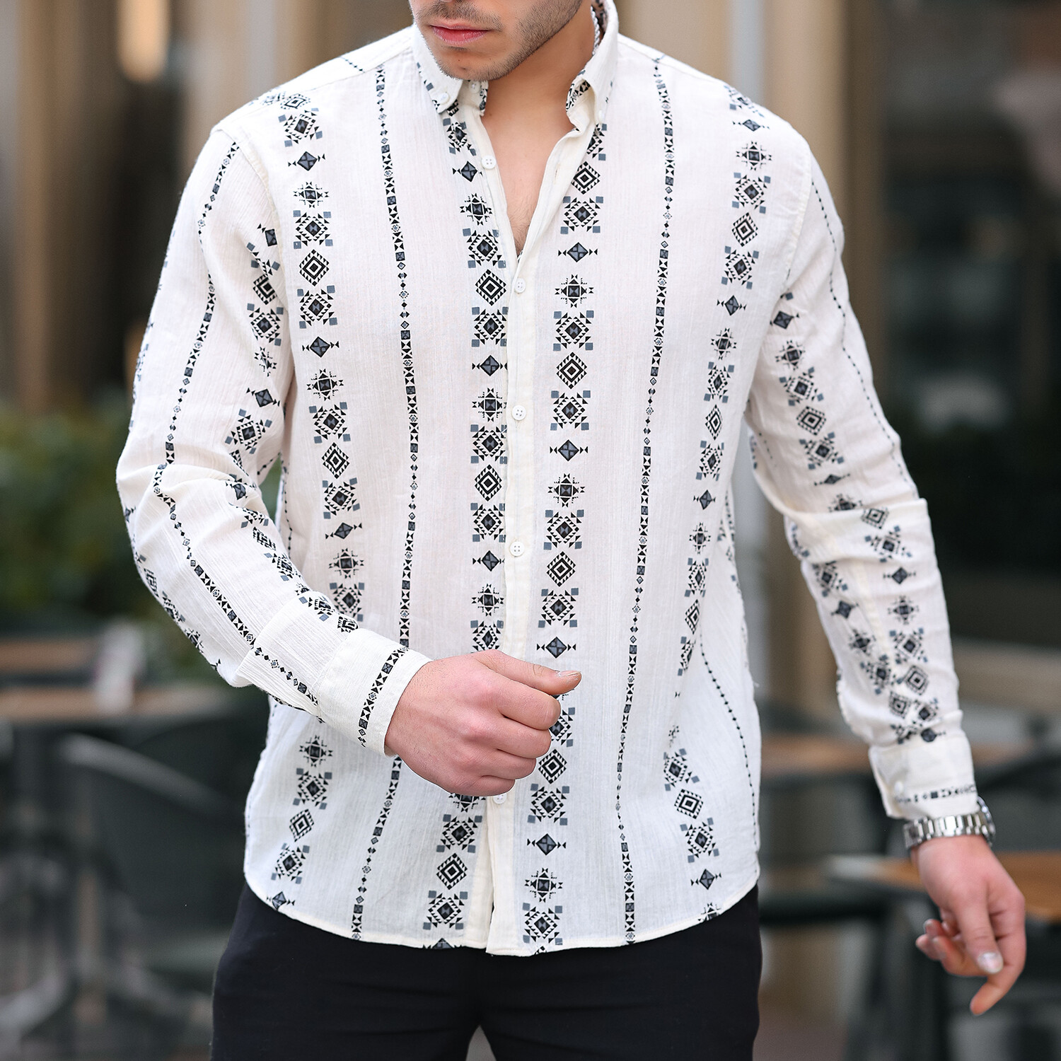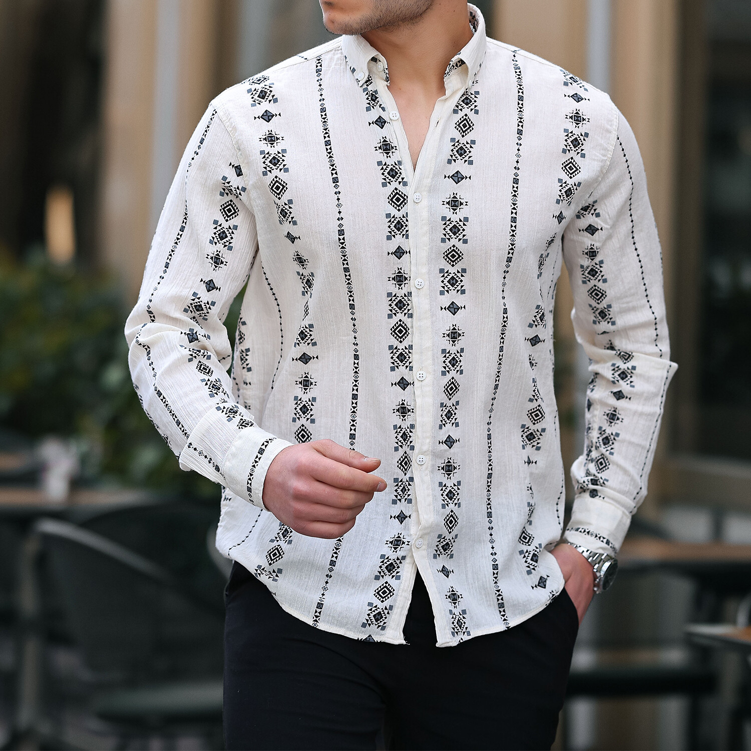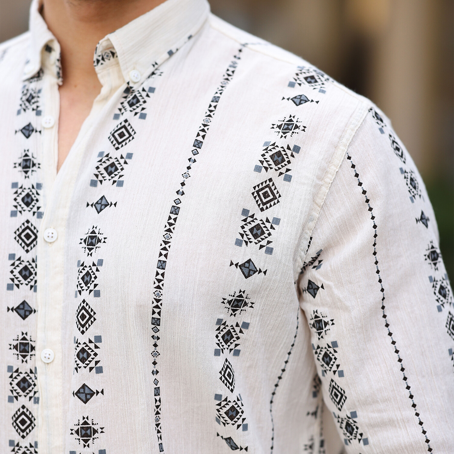 Patterned Long Sleeve Button-Up // Black + Beige