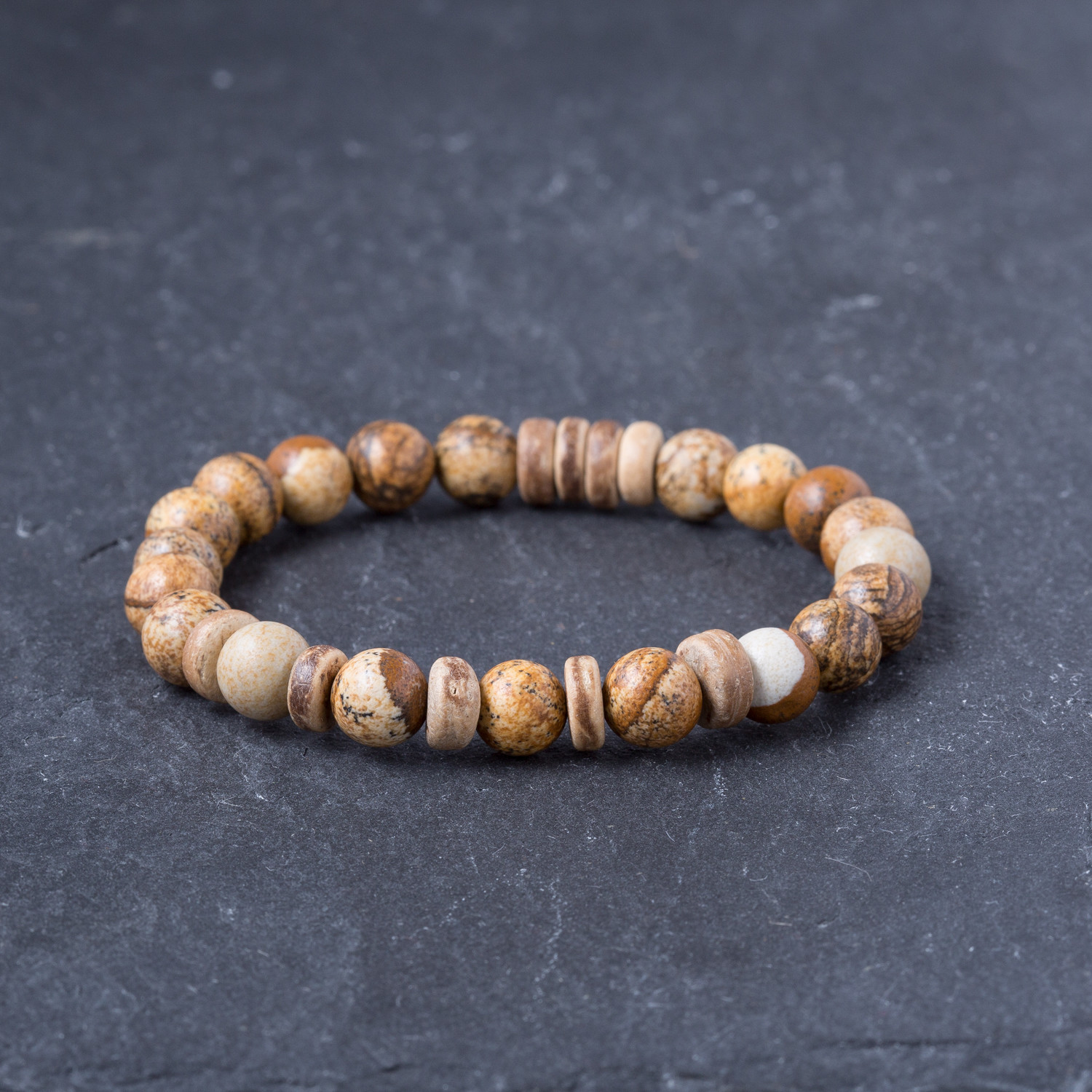 Step up your style game with this dazzling duo of bracelets. Featuring one picture jasper and coco bead bead bracelet and one complementary triple-wrap paracord bracelet, it's a contrast of textures and a muted palette of colors that will elevate any look just the right amount.