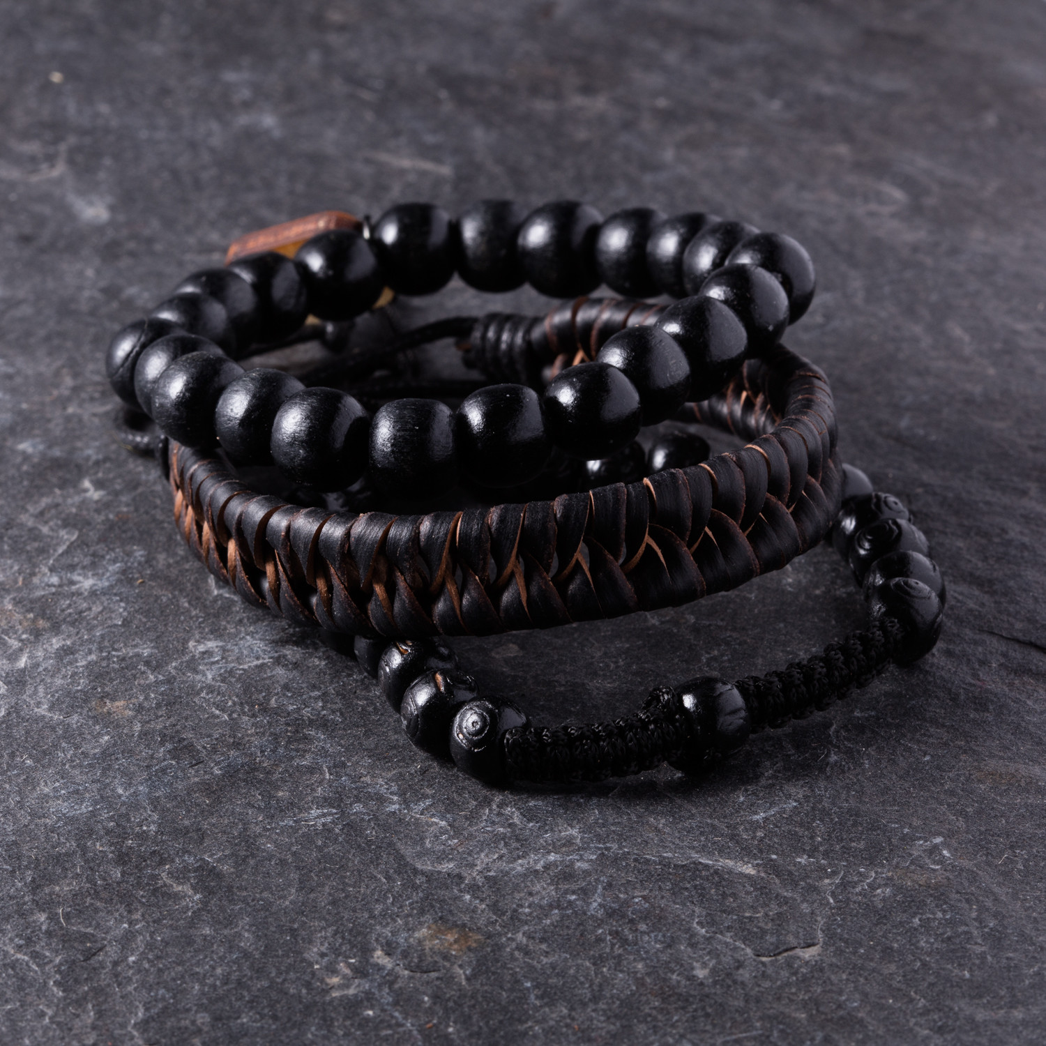 This bracelet set has all the elements you need to cap off any look. Featuring one glass rosary style adjustable bracelet, one wood beaded stretch bracelet, and one leather braided bracelet, this set has your wrist outfitted whether you're mixing and matching or wearing them together.