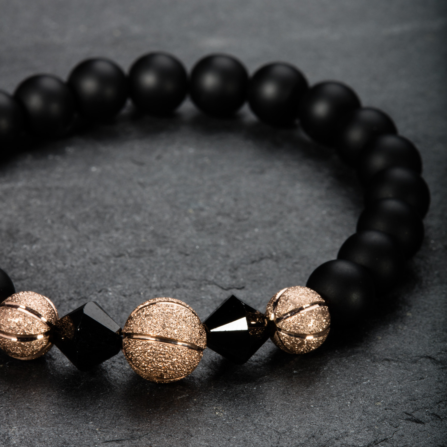 — 8mm Onyx Beaded Stretch Bracelet With Swarovski Crystals + Rose Gold Plated Accent Beads