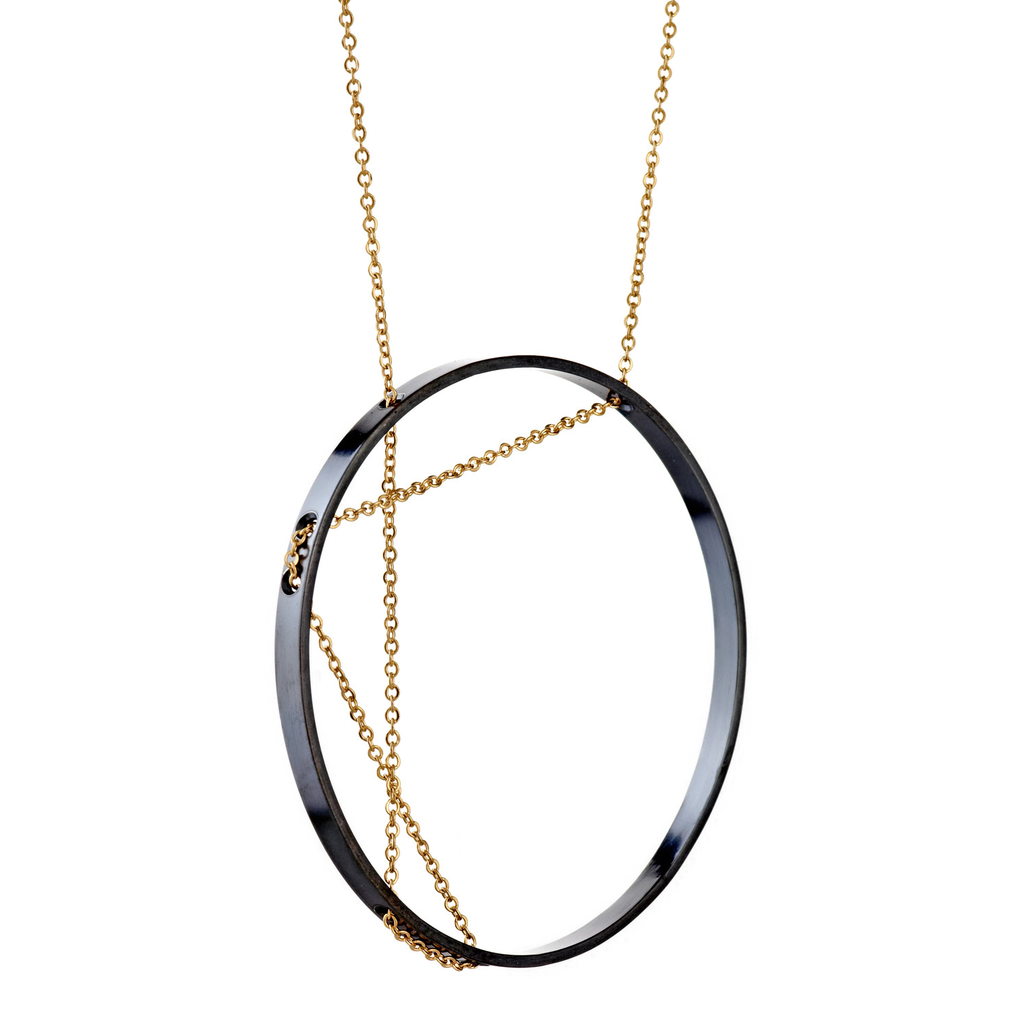 Woven through precisely drilled holes, the 14K Gold Fill chain forms an abstract pattern within a hand fabricated and oxidized sterling silver circle. The end result is one that represents class, elegance, and confidence. Well aware of its imperfect criss-crossing, this versatile necklace is playful yet contemporary--perfect for today's self-assured woman whether at work or a cocktail party.