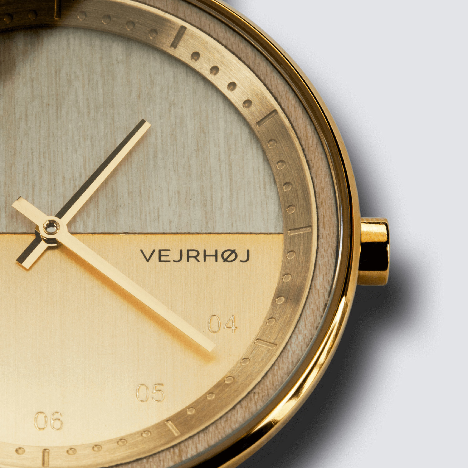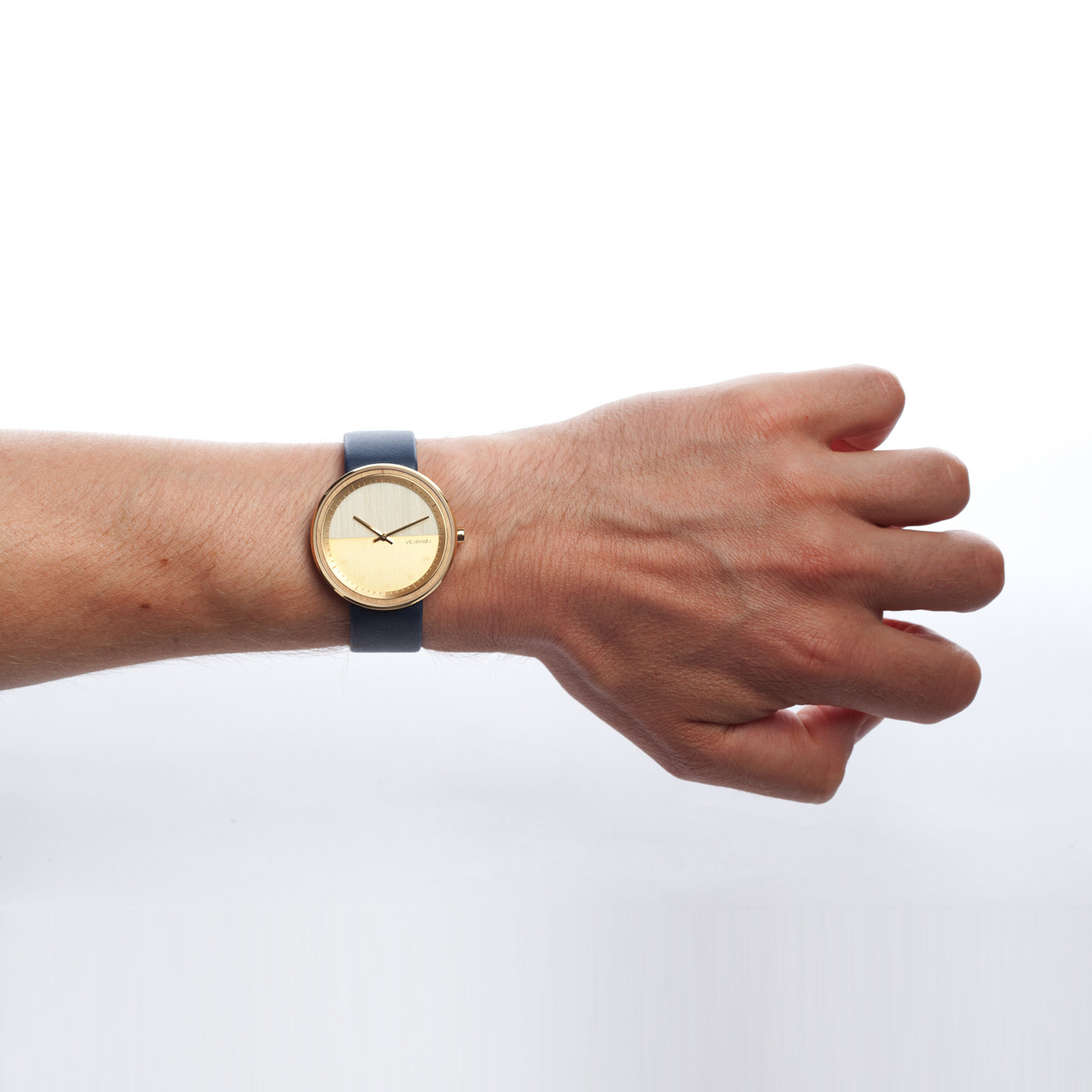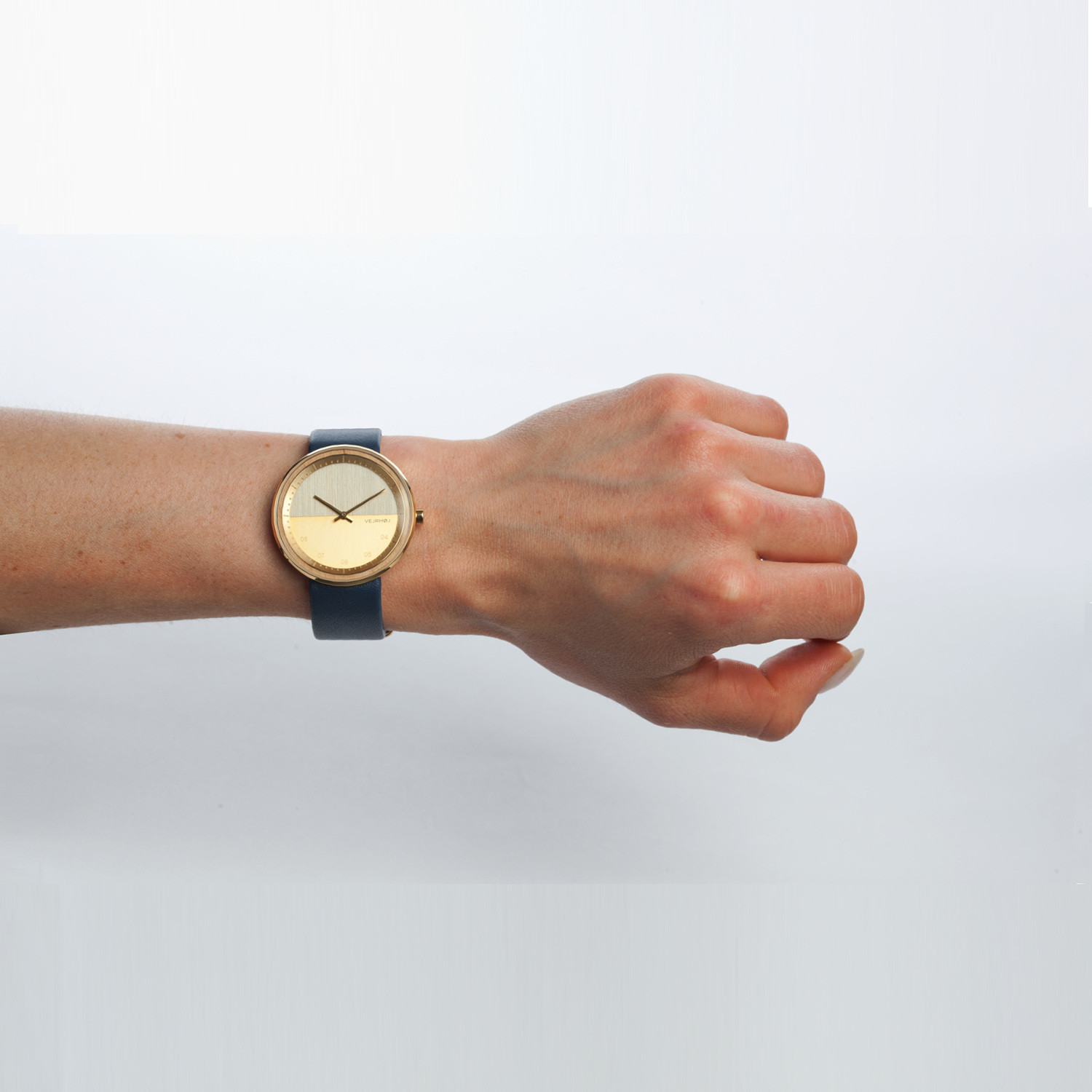 The BLUE merges natural maple wood and surgical stainless steel with a gold finish. All wooden elements of the watch are placed underneath strong sapphire crystal glass, which gives this slim timepiece the same durability as a solid steel watch. The design is classic, yet distinctive.