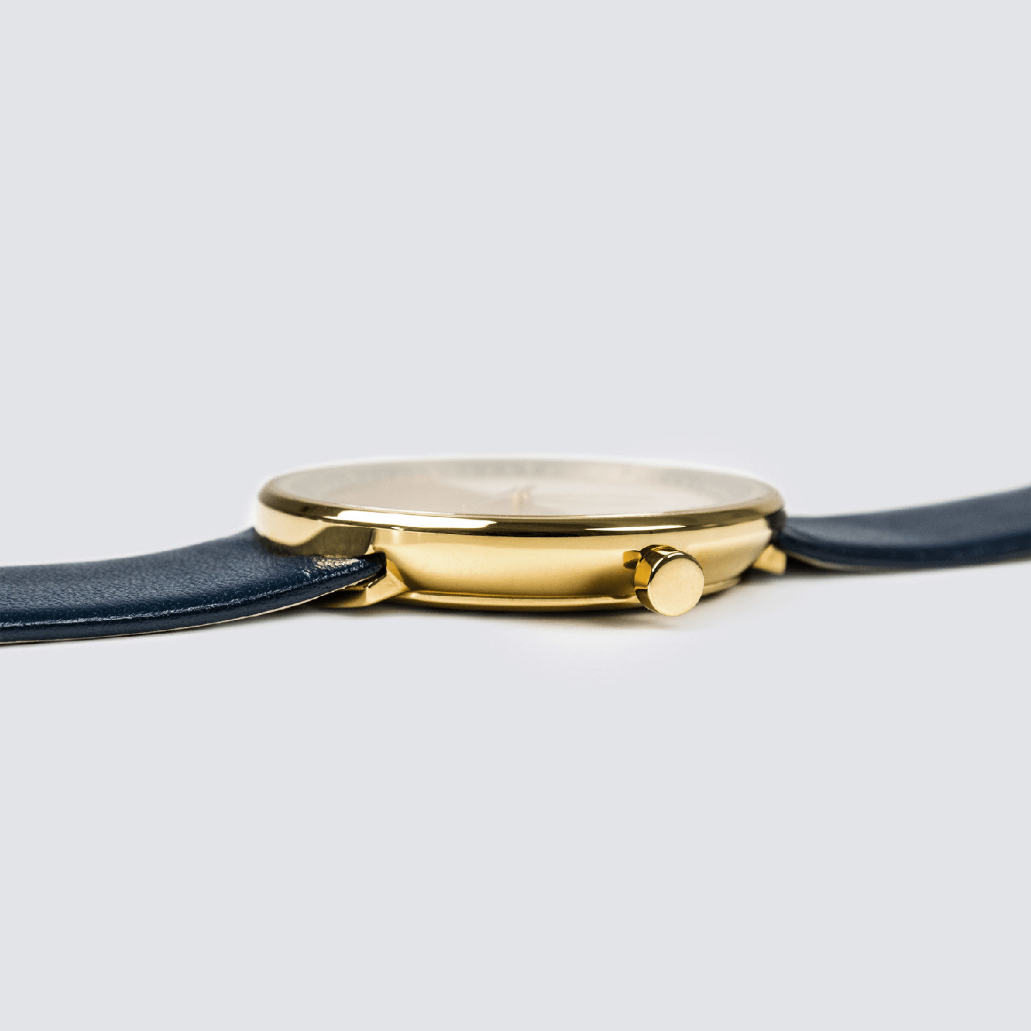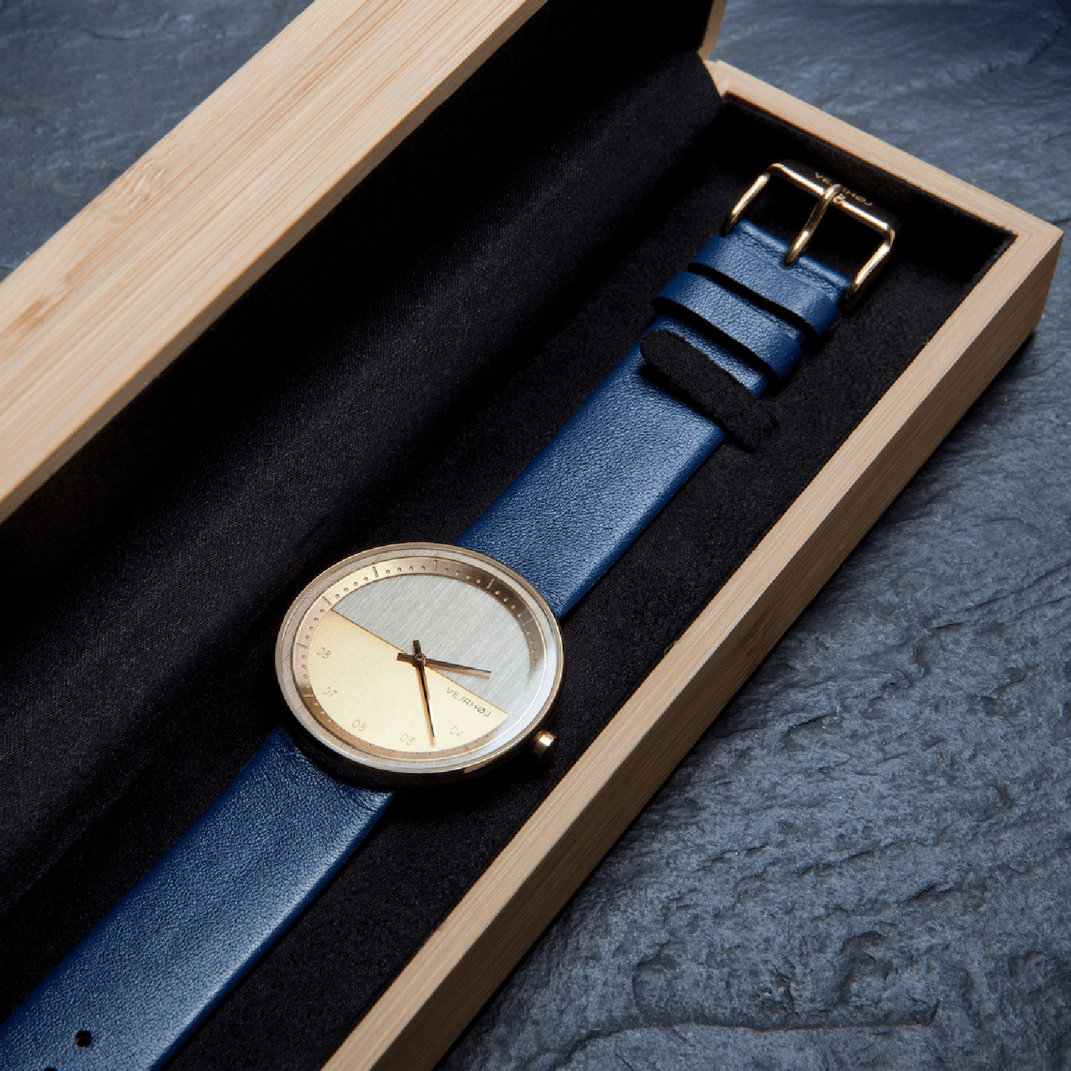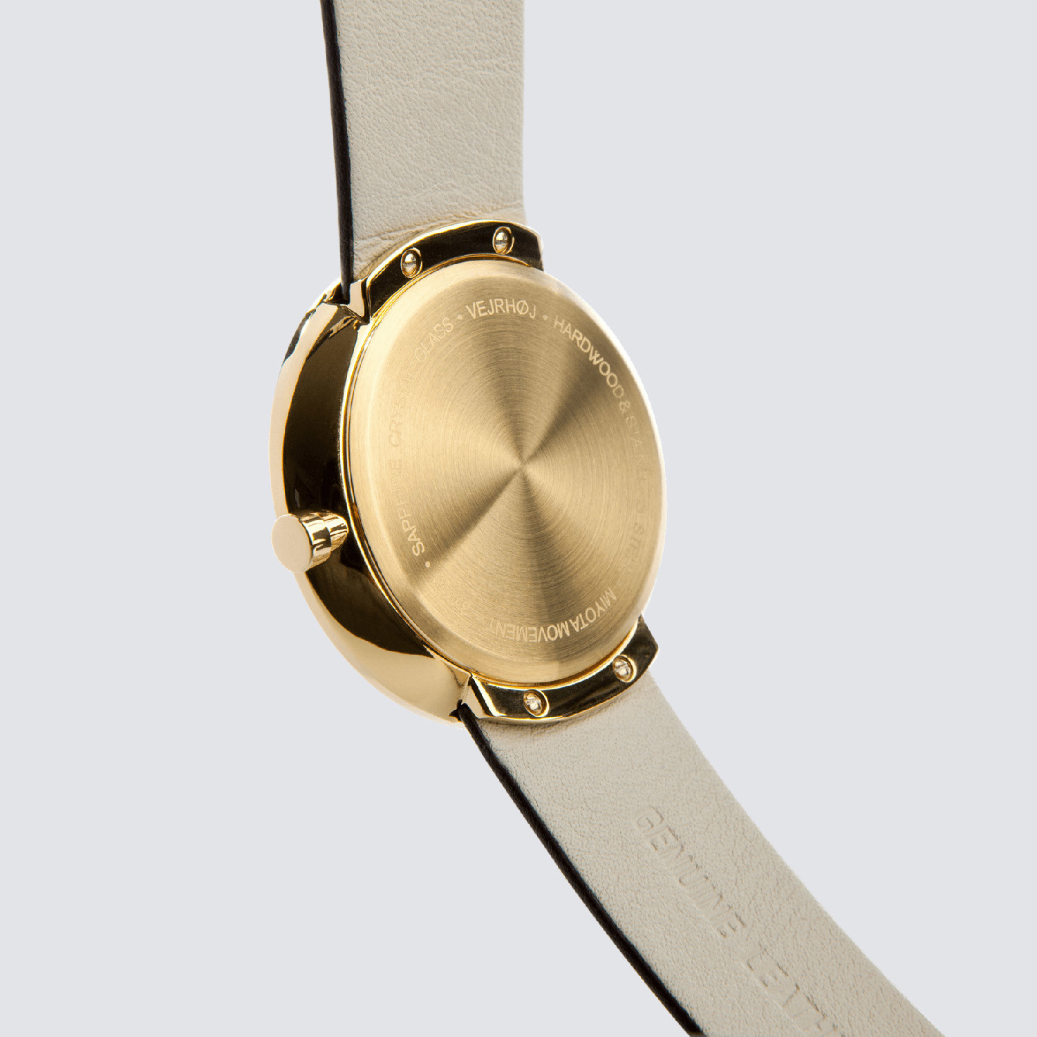 The BLUE merges natural maple wood and surgical stainless steel with a gold finish. All wooden elements of the watch are placed underneath strong sapphire crystal glass, which gives this slim timepiece the same durability as a solid steel watch. The design is classic, yet distinctive.