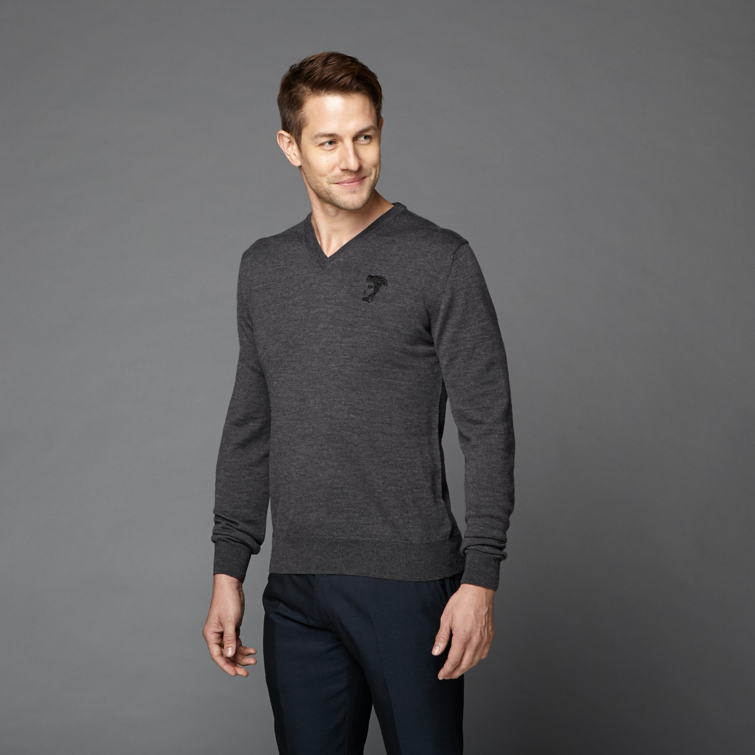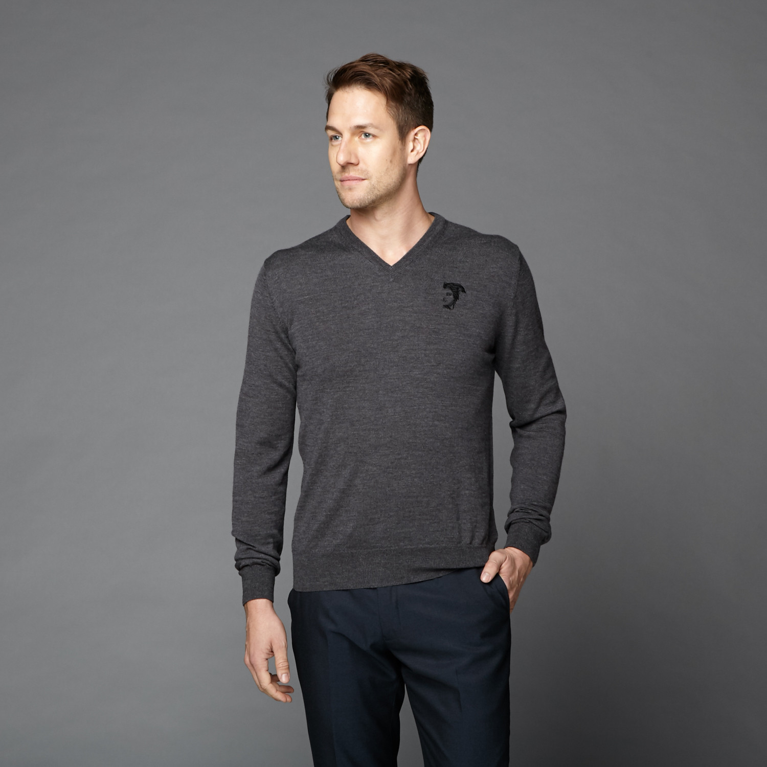 This Versace sweater is the perfect essential for business lunches and casual brunches. The pullover's half Medusa face embroidery on the chest makes it a clear-cut designer piece, while fine ribbing of the cuffs and hem helps it hold a slim, flattering shape.