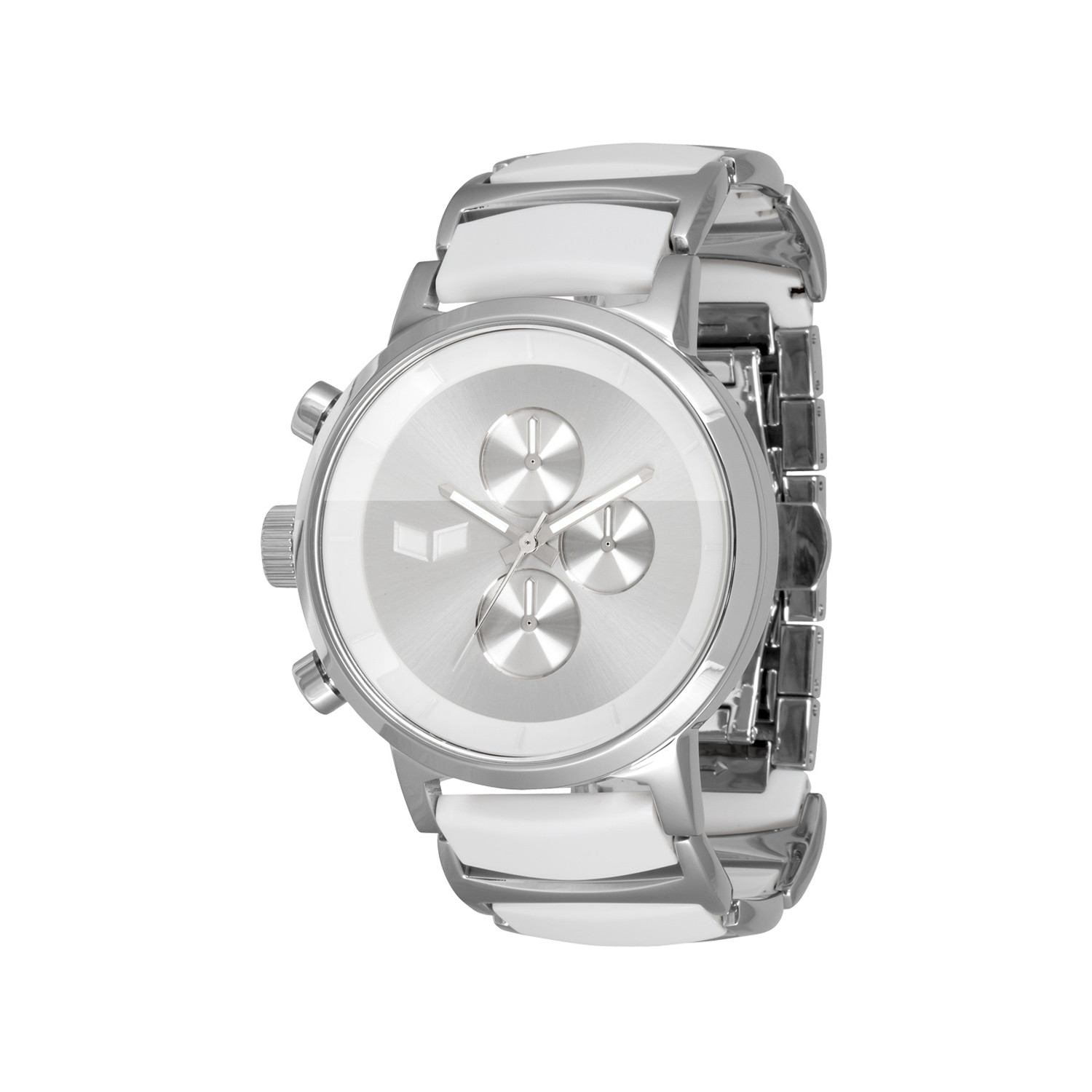 The Metronome has clean lines, minimalistic features and machined curves throughout its design to give it a futuristic feel. Its premium chronograph movement is steady in its ticks and is enclosed in a top loaded, round 46mm 316L solid stainless steel case that yields a 10 ATM depth rating. The top loaded construction not only adds strength and durability but allows the unique design curvature of the case and band to continue through its case-back, reminiscent of fine hand-made craftsmanship of yesteryear. Its bracelet inspired, curved band joins a 22mm acetate inner link with a 28mm outer stainless steel link creating a very unique signature aesthetic while following the natural curvature of your wrist. The Metronome is finished with a knurled 9 o’clock positioned screw-down crown and an easy-access battery hatch.