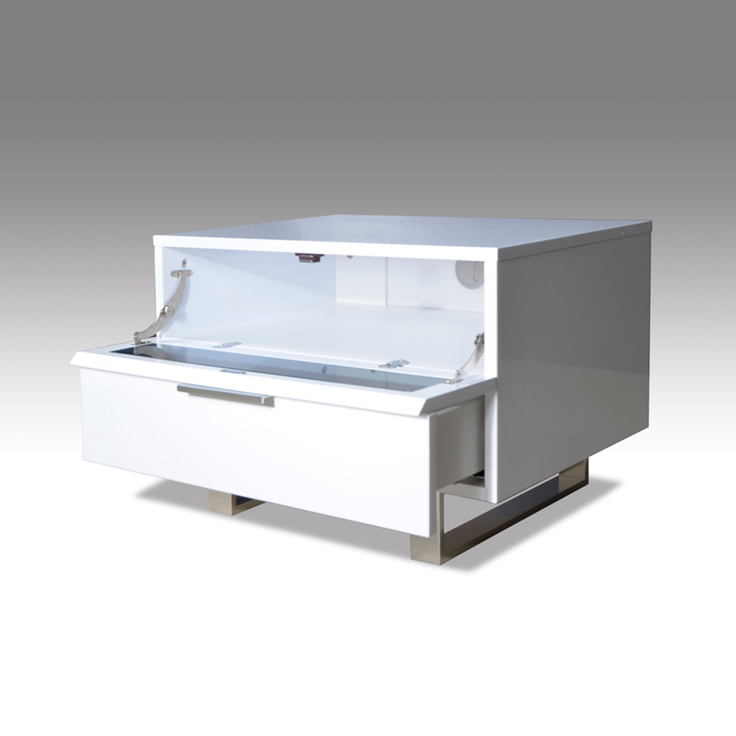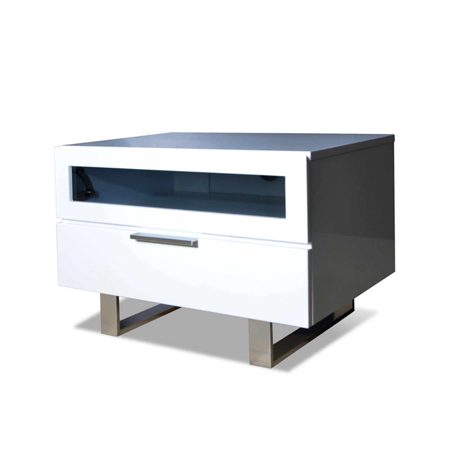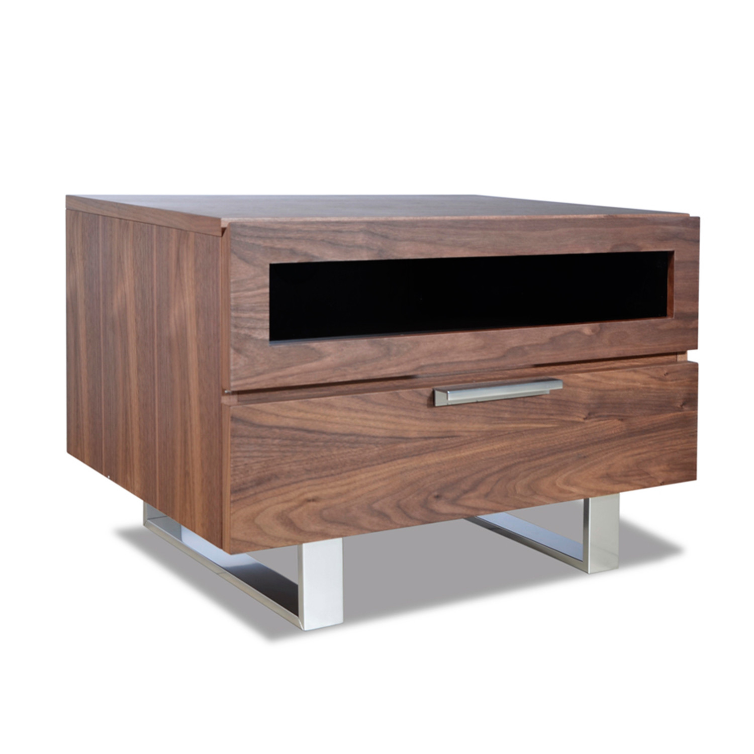 The walnut veneer finish of this Dylan nightstand adds to its modern style and sensibility. This nightstand features a smoked tempered glass window in a pull down door as a unique storage option. It is also crafted with 1 drawer and 1 electrical wire hole to provide additional convenience. With stainless steel handles and legs, it's the perfect modern accessory.