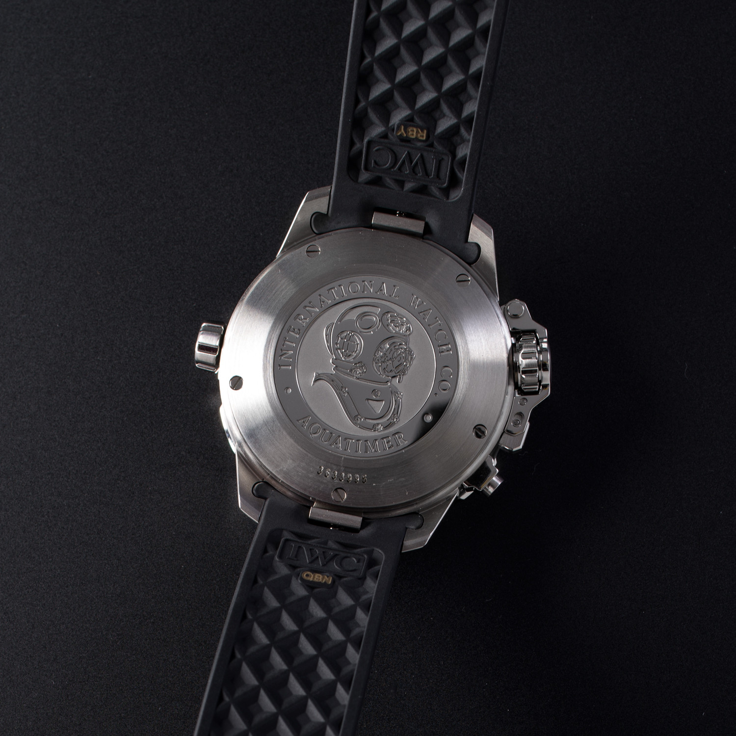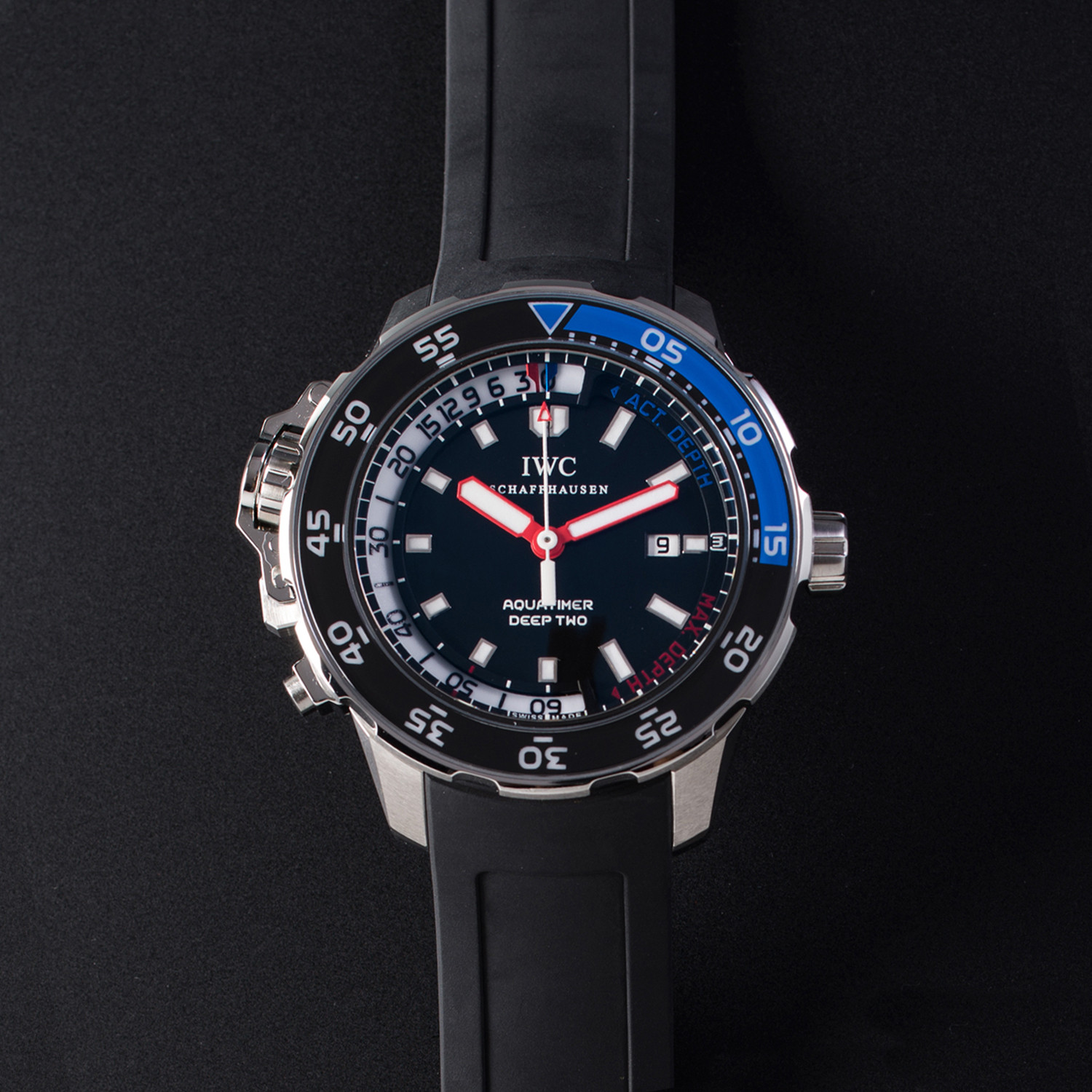 This IWC Aquatimer Deep Two watch presents a 46 mm polished and brushed stainless steel case with a bold black dial, super luminous hands and index hour markers, a luminous depth gauge indicator, a unidirectional 60-minute rotating black bezel, and a black rubber strap with a pin buckle. Features on this watch also include an automatic movement with a mechanical depth gauge which functions to 50 meters, sweep seconds, and date. The IWC Aquatimer Deep Two watch has a screw-down crown that allows for a water resistance to 120 meters.