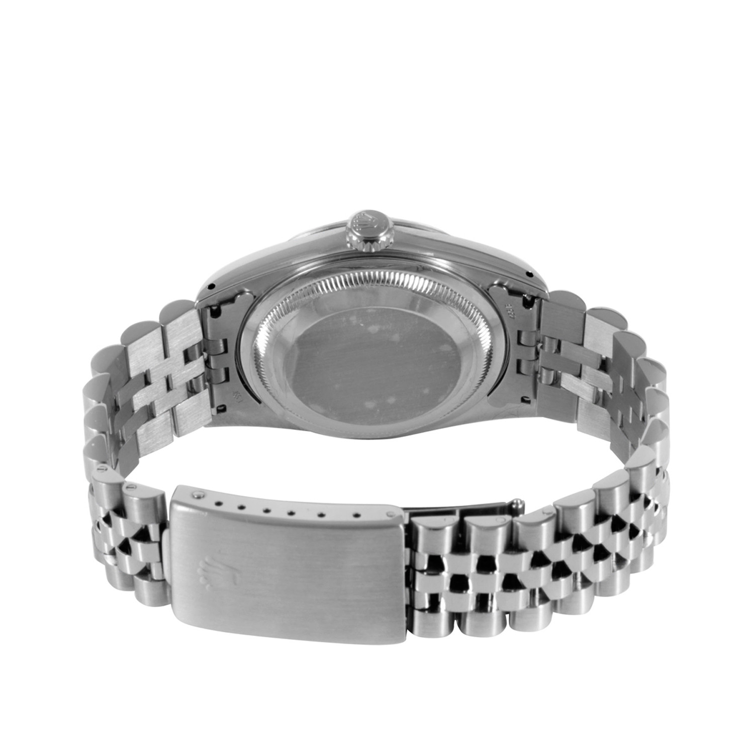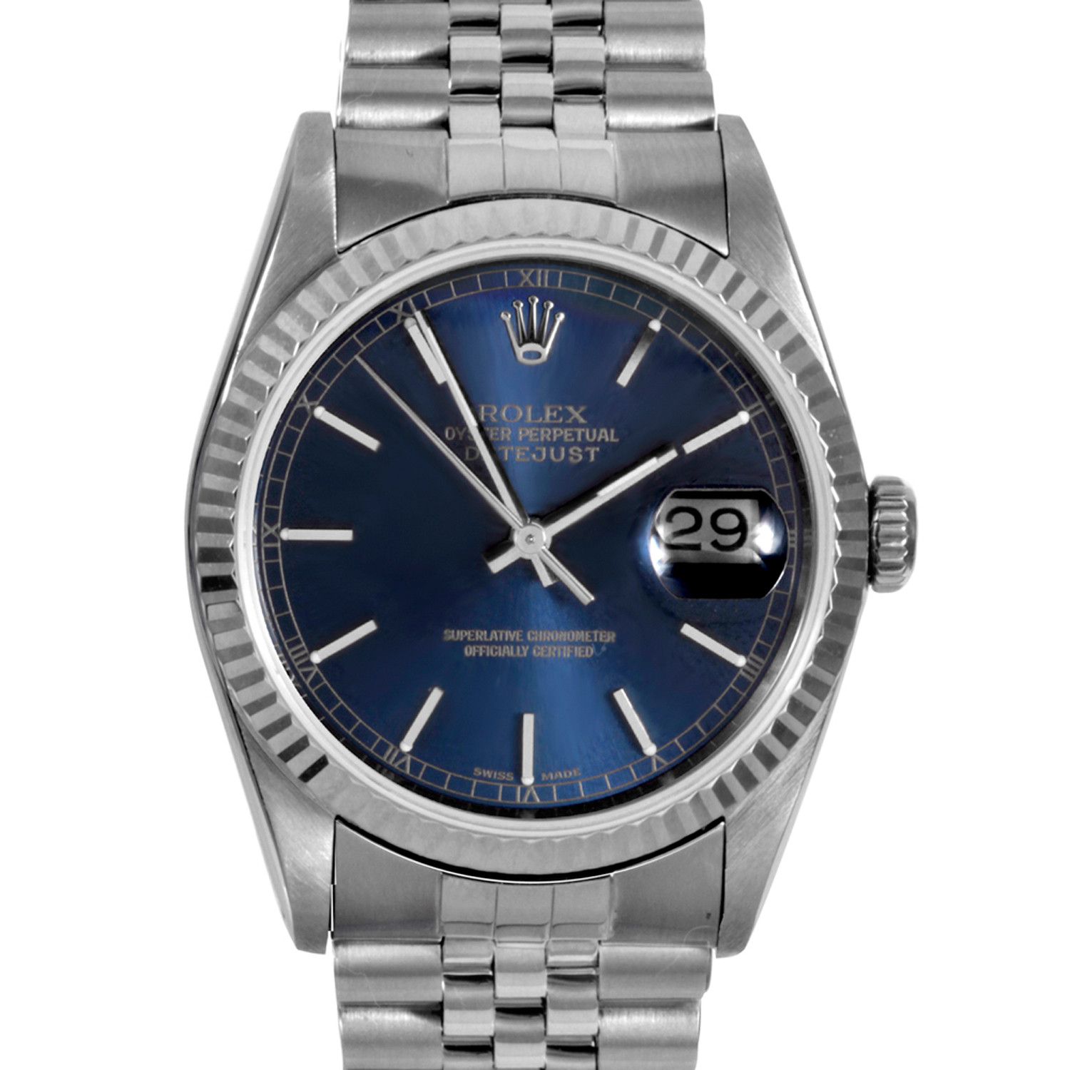Rolex's Oyster Perpetual Datejust watches are handsome, classic luxury timepieces. This stainless steel model features a sleek navy blue dial with bold markers and refined roman numerals. Rolex's horological legacy means that this watch is expertly made, from the hermetically sealed, waterproof Oyster case to its scratch-resistant sapphire Cyclops lens. This watch is a classic you'll cherish for years to come.