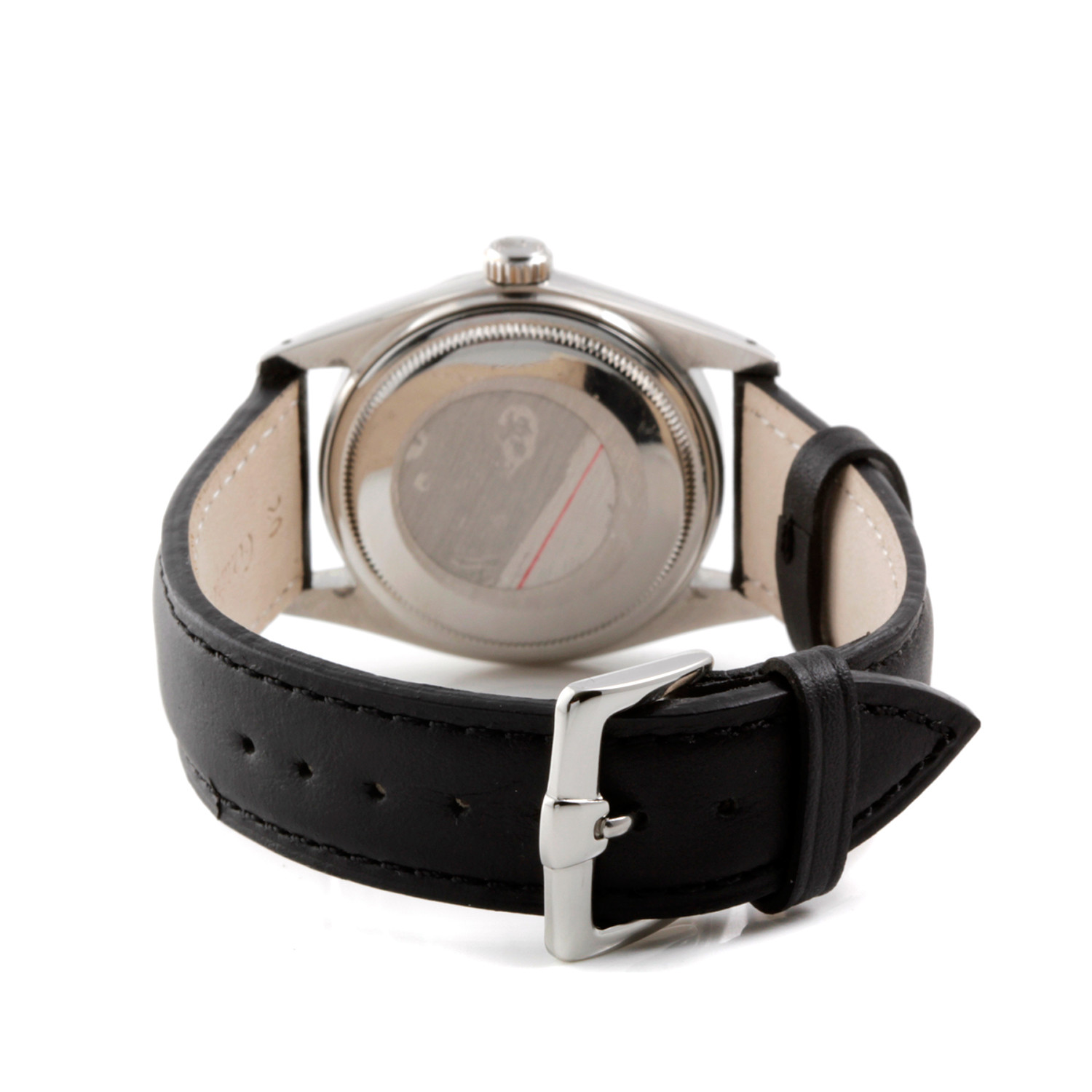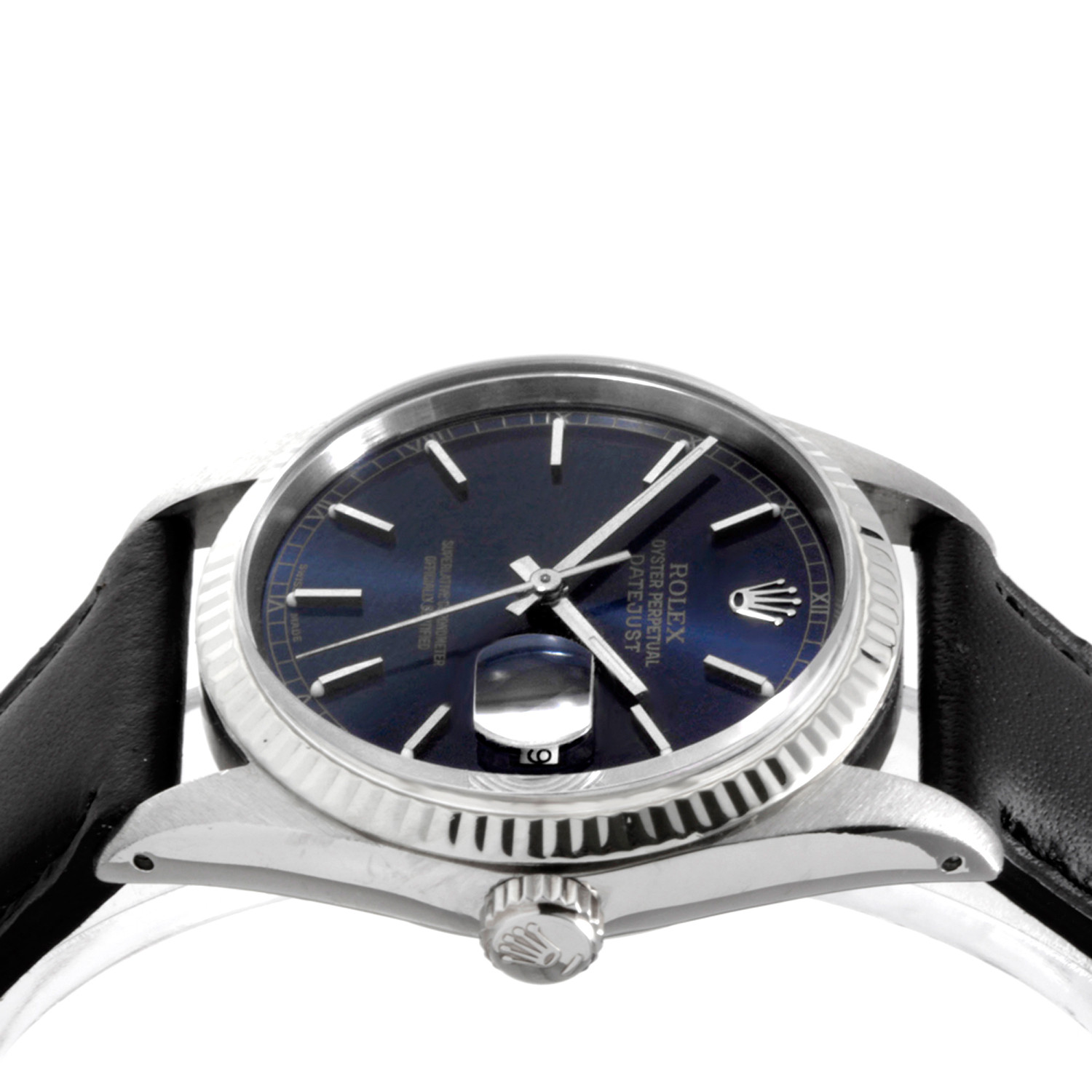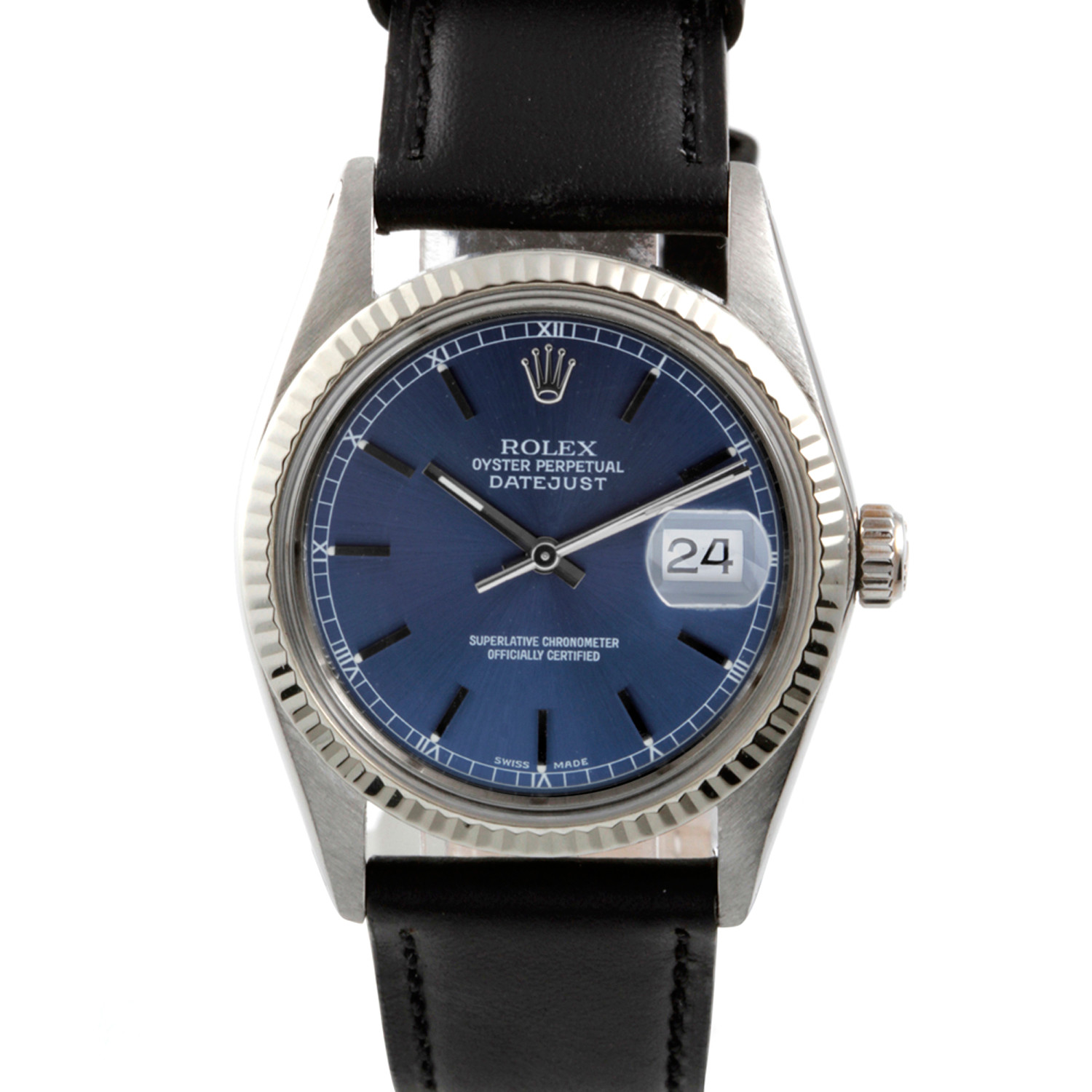 Rolex's Oyster Perpetual Datejust watches are handsome, classic luxury timepieces. This model features a sleek stainless steel case and bezel with a soft black leather wrist band. Rolex's horological legacy means that this watch is expertly made, from the hermetically sealed, waterproof Oyster case to its scratch-resistant sapphire Cyclops lens. This watch is a classic you'll cherish for years to come.