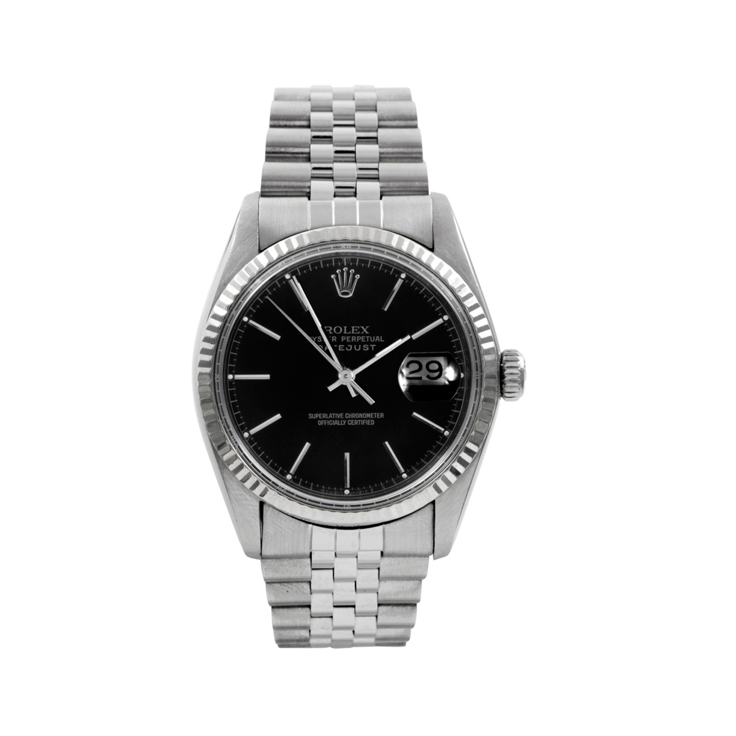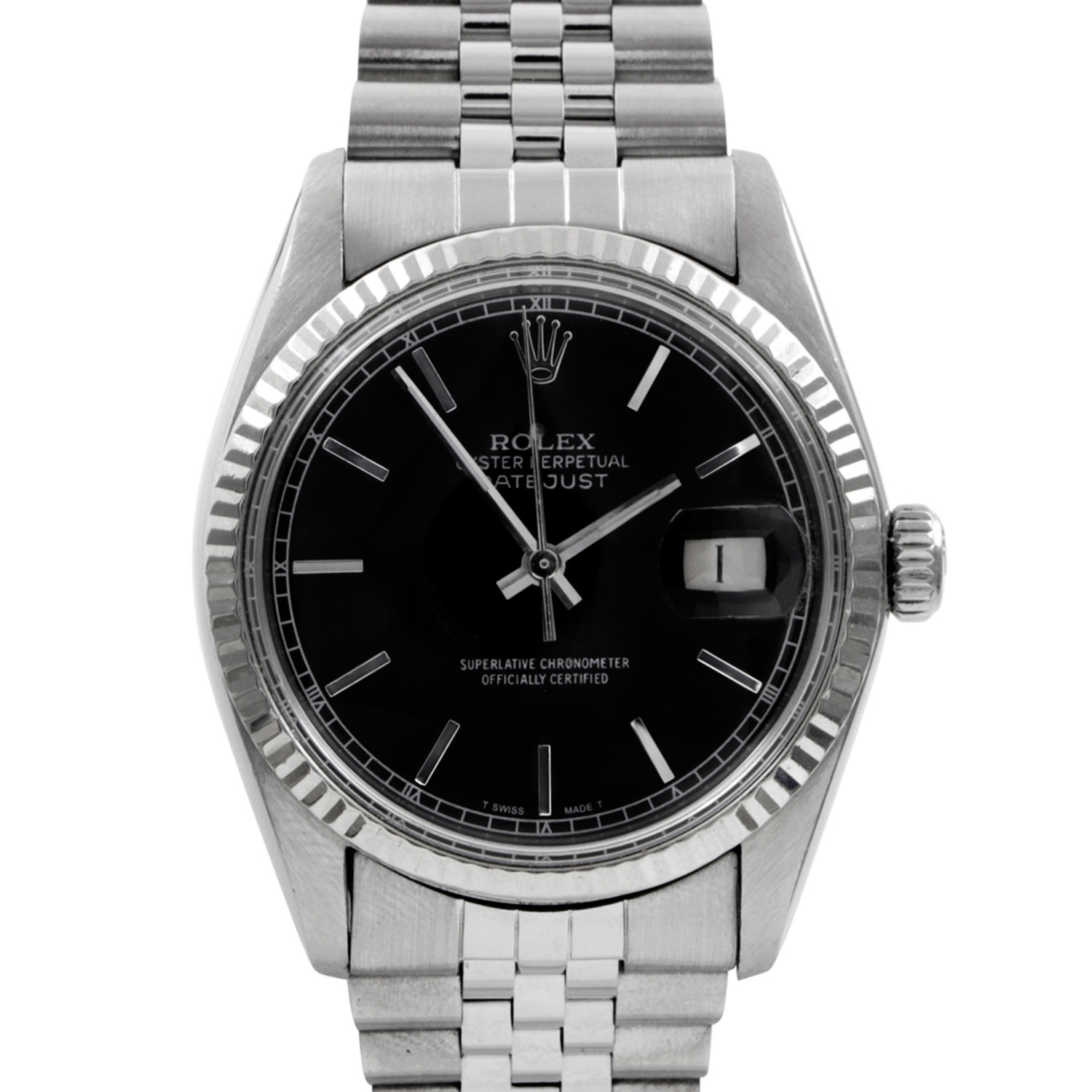Rolex's Oyster Perpetual Datejust watches are handsome, classic luxury timepieces. This stainless steel model features a sleek black dial with bold markers and refined roman numerals. Rolex's horological legacy means that this watch is expertly made, from the hermetically sealed, waterproof Oyster case to its scratch-resistant sapphire Cyclops lens. This watch is a classic you'll cherish for years to come.