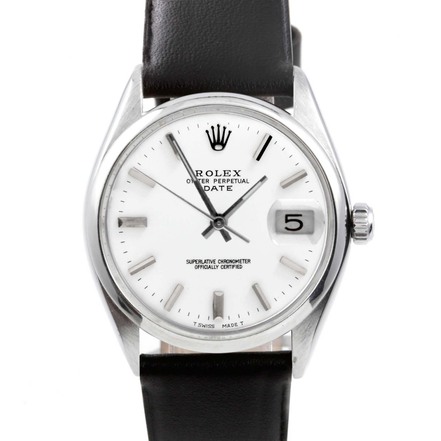 — Rolex Stainless Steel 34MM Date with White Index Dial and Generic Black Leather Strap