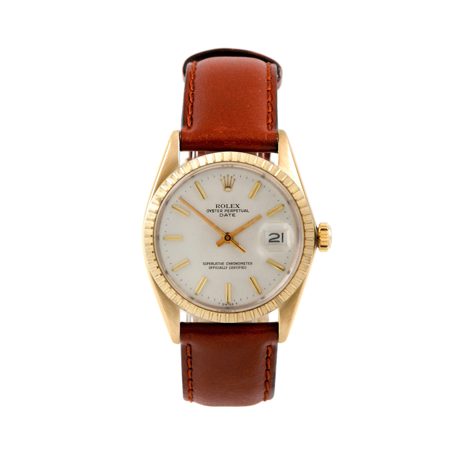 The Rolex Yellow Gold Date, with its Silver Index Dial and Generic Brown Leather Strap, is a minimal watch that uses clean design language and pared-back lines to craft an utterly perfect piece that has every detail you need and none that you don't. It's perfect for the utilitarian aesthete.