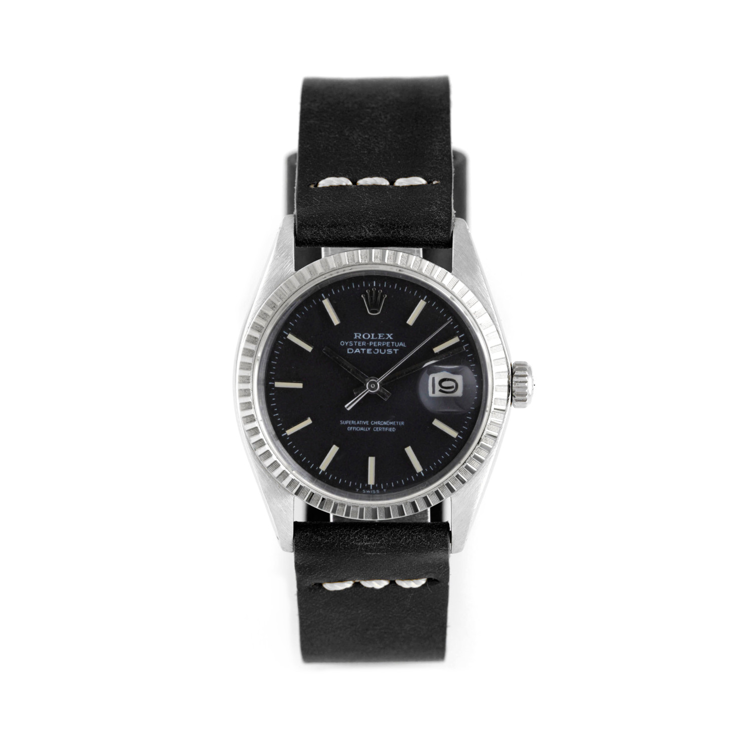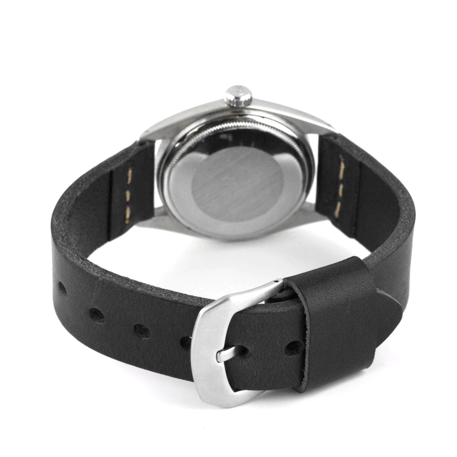 The Rolex Stainless Steel Men's 36mm Datejust with Black Index dial and Generic Black Leather Strap is a handsome luxury timepiece. This model features a sleek dial with bold markers and refined numerals. Rolex's horological legacy means that this watch is expertly made, from the hermetically sealed, waterproof case to its scratch-resistant lens. This watch is a classic you'll cherish for years to come.