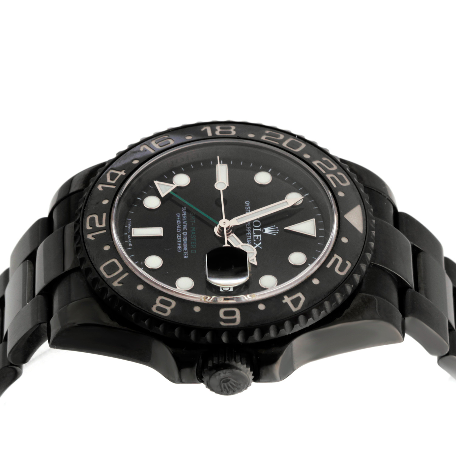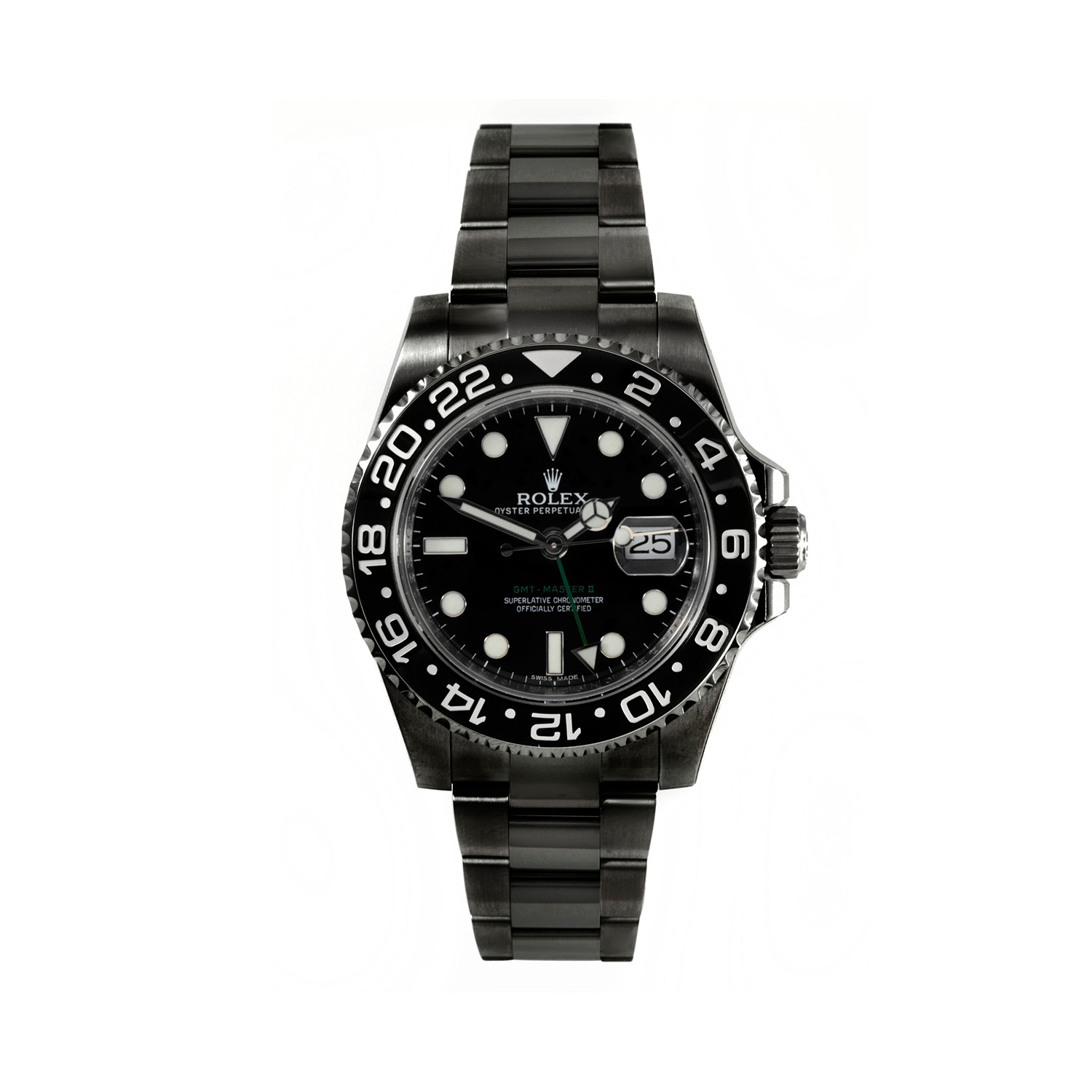 Rolex is synonymous with storied quality and this timepiece is a classic example. This model features Rolex automatic movement, a bi-directional bezel, and a stainless steel, PVD-coated oyster bracelet. The GMT Master comes with a 2 year warranty on the movement, sapphire crystal and round hour markers for convenience and style.