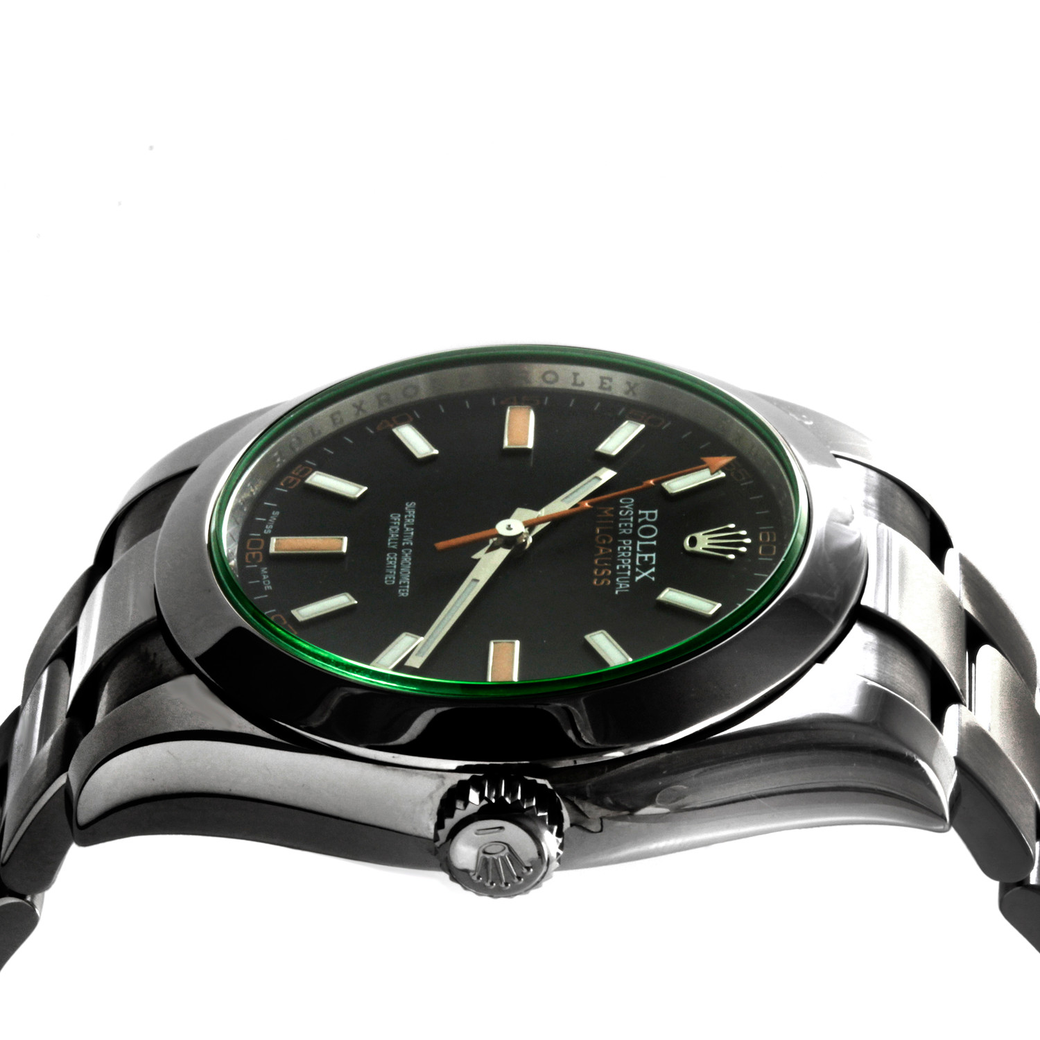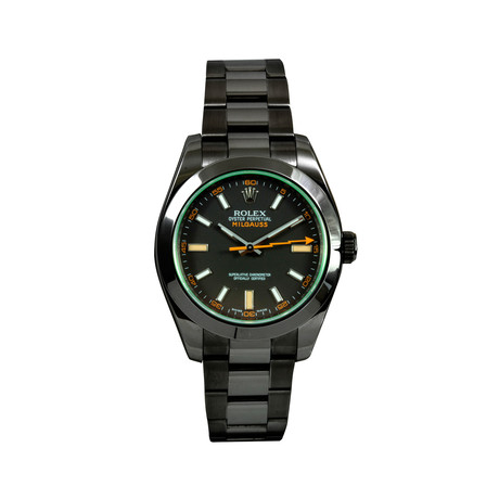 The Rolex Milgauss is a unique watch in Rolex's line. While most watches are made of ferrous materials, the Milgauss is made entirely out of antimagnetic materials and designed specifically for engineers. This model features Rolex automatic movement, a black dial, and a stainless steel PVD-coated band. The Milgauss comes with a 2 year warranty on the movement.