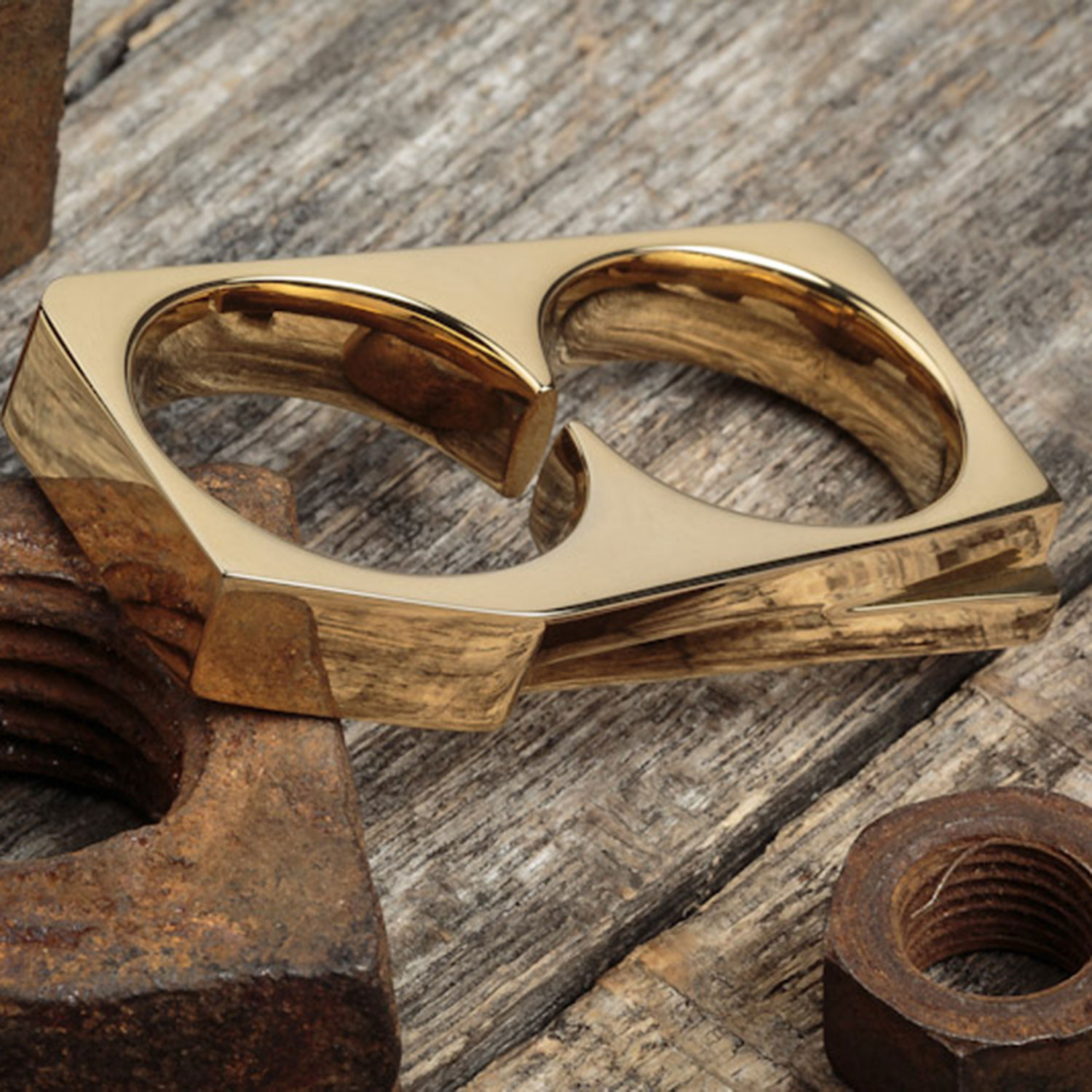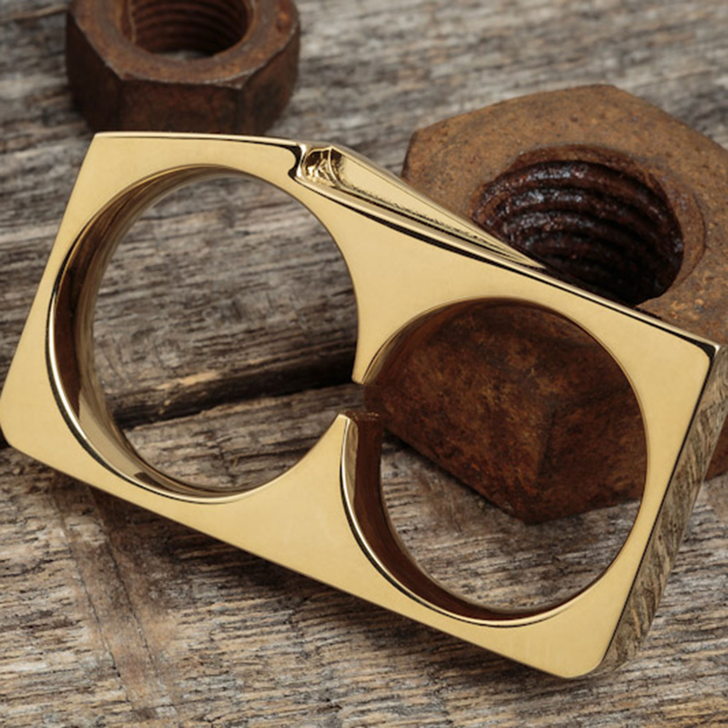 This two finger ring is crafted from stainless steel and finished with gold plating. It adds a handsome, subversive touch to any look.