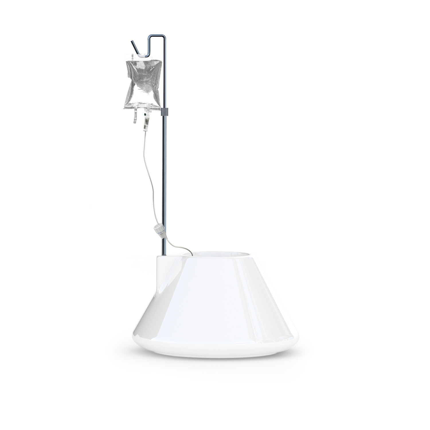 This self-watering plant pot's main feature is a medical drip feed. This unique characteristic allows the plant to be nourished with water and food as it is required. The drip feed provides a striking design focus and reminds its owner when it needs topping off.
