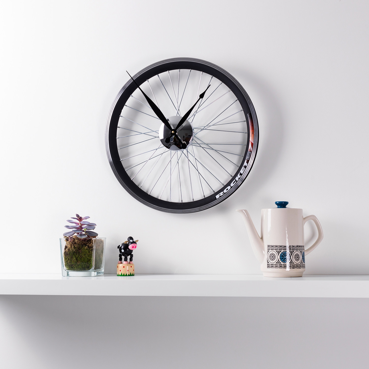 This stunning bike wheel clock is produced using a high specification, 18-inch racing bicycle wheel. The wheel has a curved, two-tone, matte black inner edge, and a silver finished outer edge, with a chrome hub that houses the clock mechanism. Using a single screw, the clock sits flush to the wall, giving the illusion that it is floating. Whether you're a lover of cycling, one-of-a-kind clocks, or just great design, it's a distinguished art piece for any space.