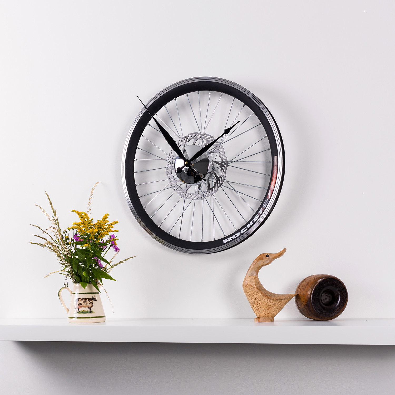 This stunning bike wheel clock is produced using a high specification, 18-inch racing bicycle wheel. The wheel has a curved, two-tone, matte black inner edge, and a silver finished outer edge, with a chrome hub that houses the clock mechanism. Using a single screw, the clock sits flush to the wall, giving the illusion that it is floating. Whether you're a lover of cycling, one-of-a-kind clocks, or just great design, it's a distinguished art piece for any space.