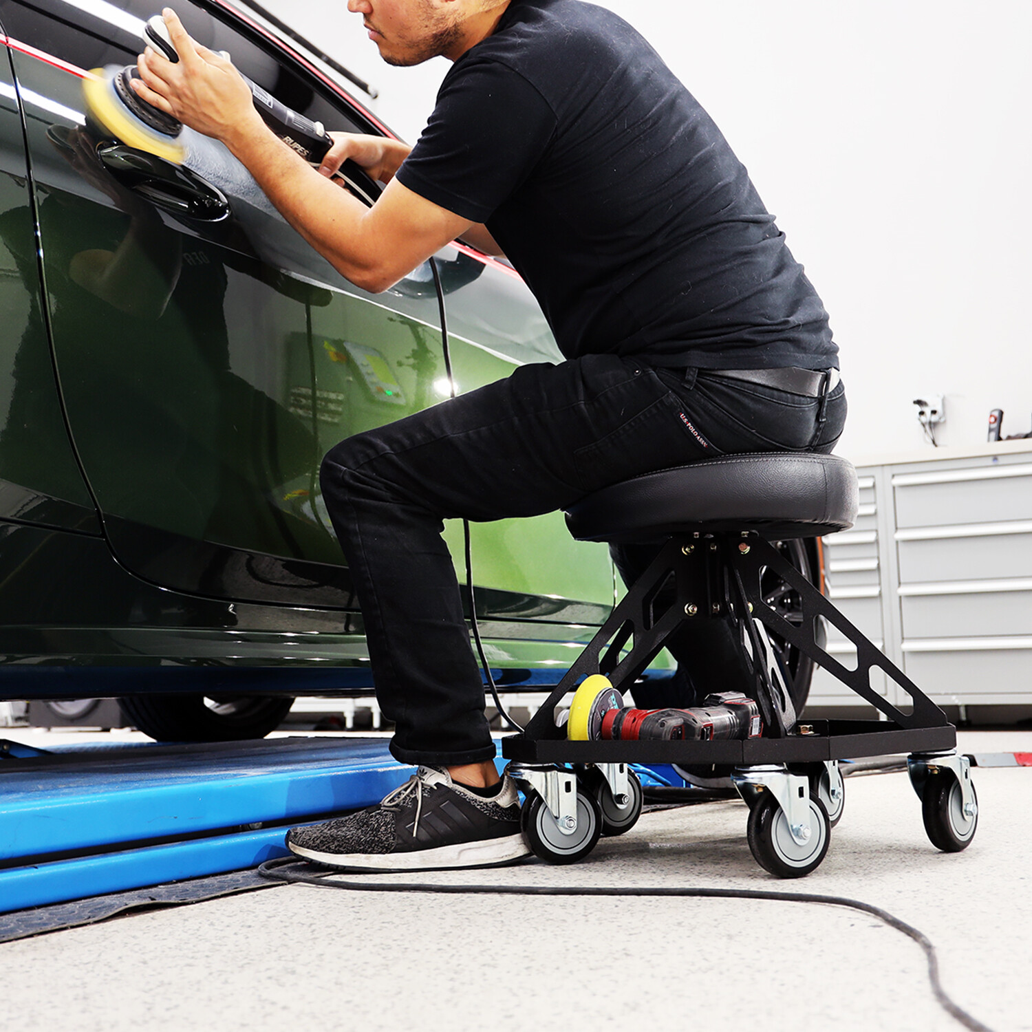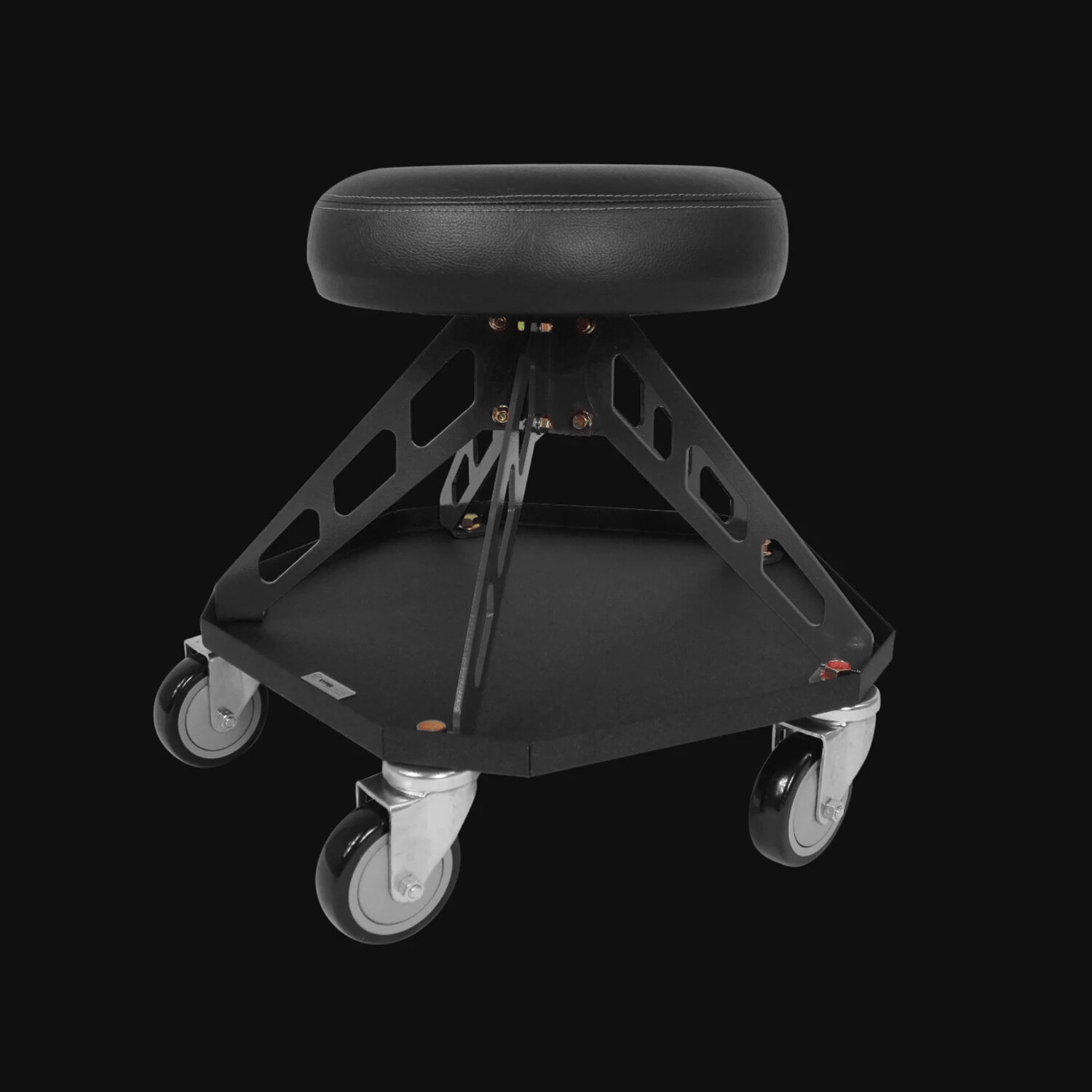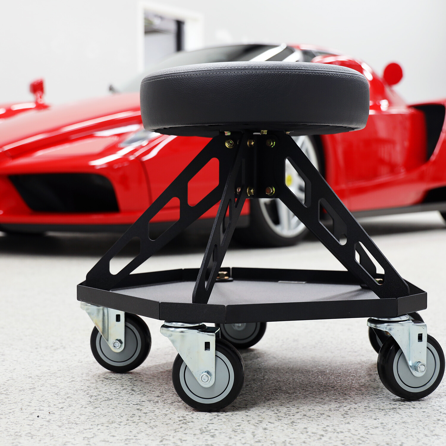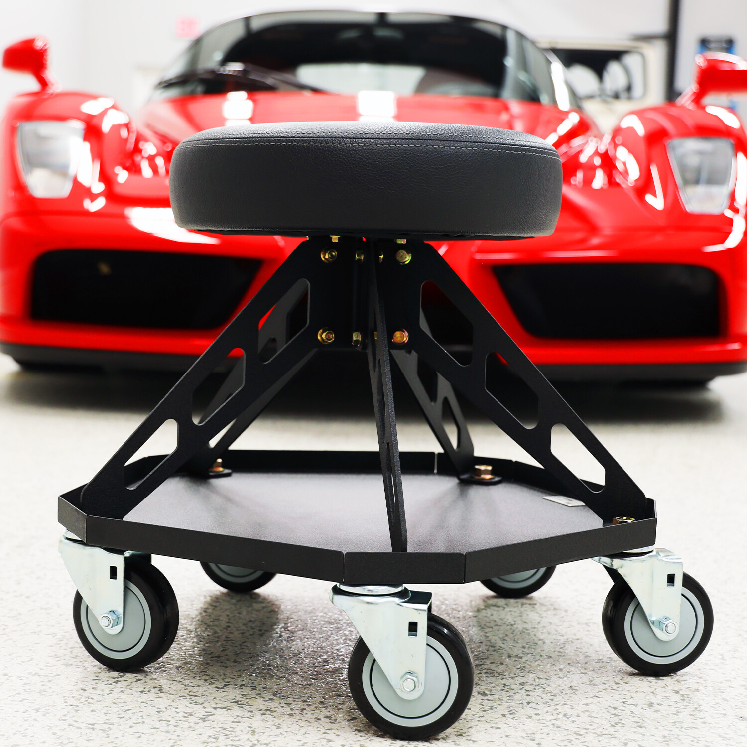Comfort is key. The PRO is equipped with a premium quality seat measuring 14” in diameter. 4” thick industrial-grade foam padding will keep you comfortable for long sitting durations. The PRO has an all-steel powder coated base with yellow zinc coated high-grade hardware to prevent corrosion. Organization is no problem thanks to the built-in tool tray featuring smooth rolled edges and a powder coated finish. The PRO features 4” industrial-grade casters to provide premium rolling ability on all surfaces.