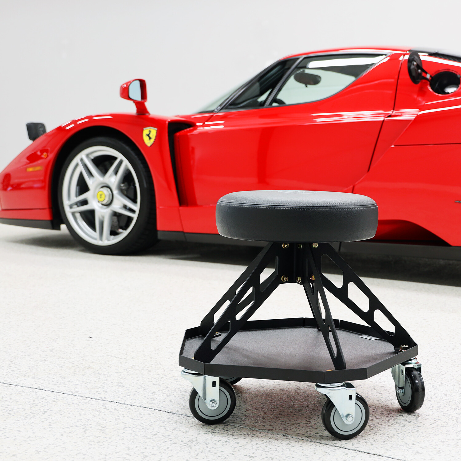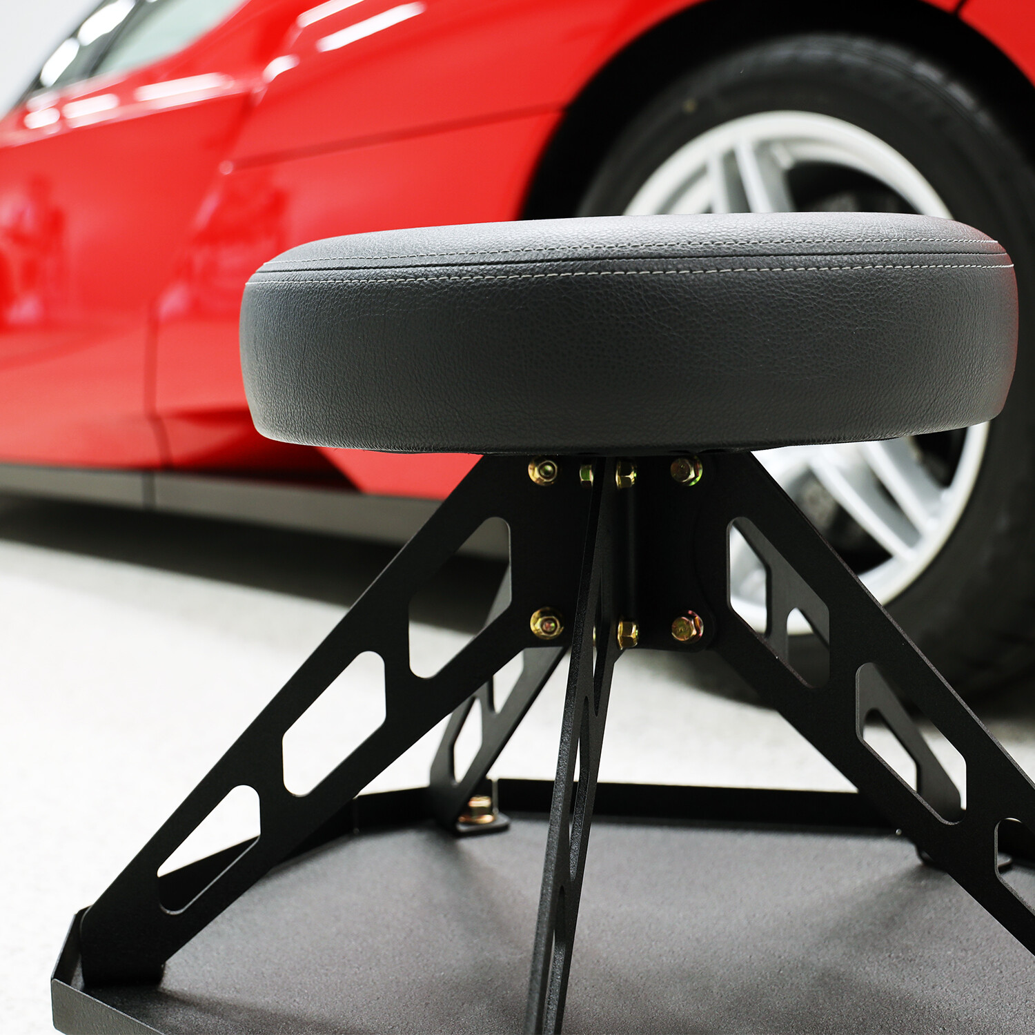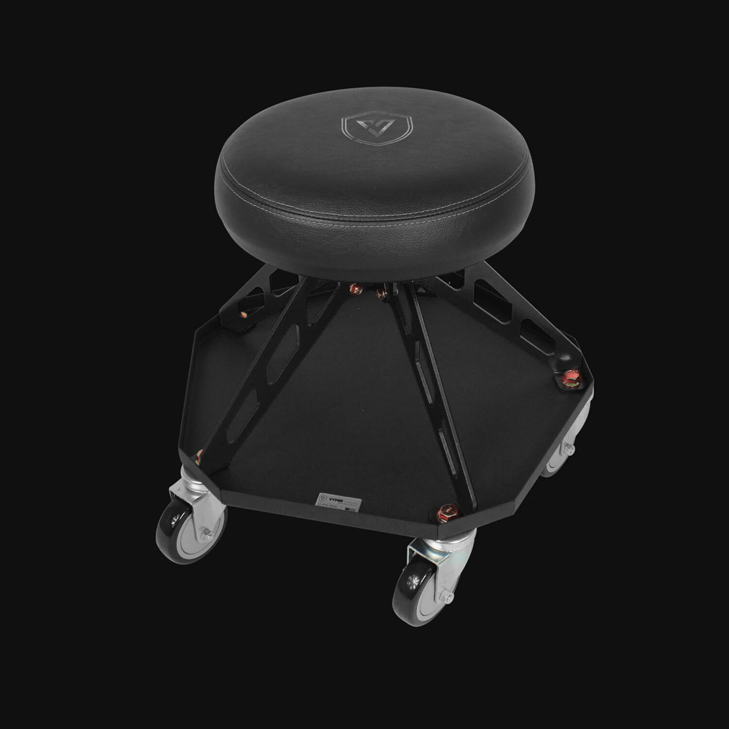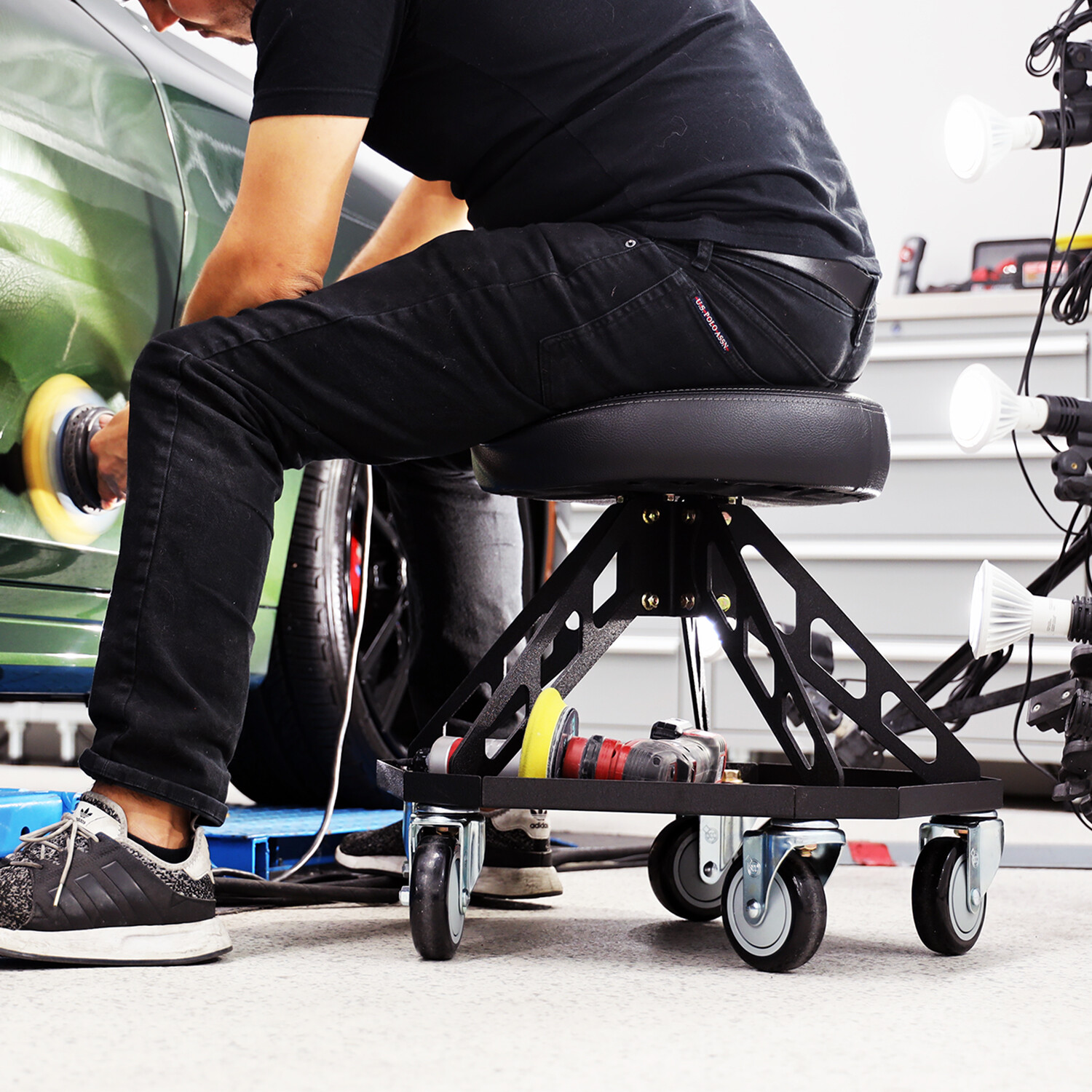 Comfort is key. The PRO is equipped with a premium quality seat measuring 14” in diameter. 4” thick industrial-grade foam padding will keep you comfortable for long sitting durations. The PRO has an all-steel powder coated base with yellow zinc coated high-grade hardware to prevent corrosion. Organization is no problem thanks to the built-in tool tray featuring smooth rolled edges and a powder coated finish. The PRO features 4” industrial-grade casters to provide premium rolling ability on all surfaces.