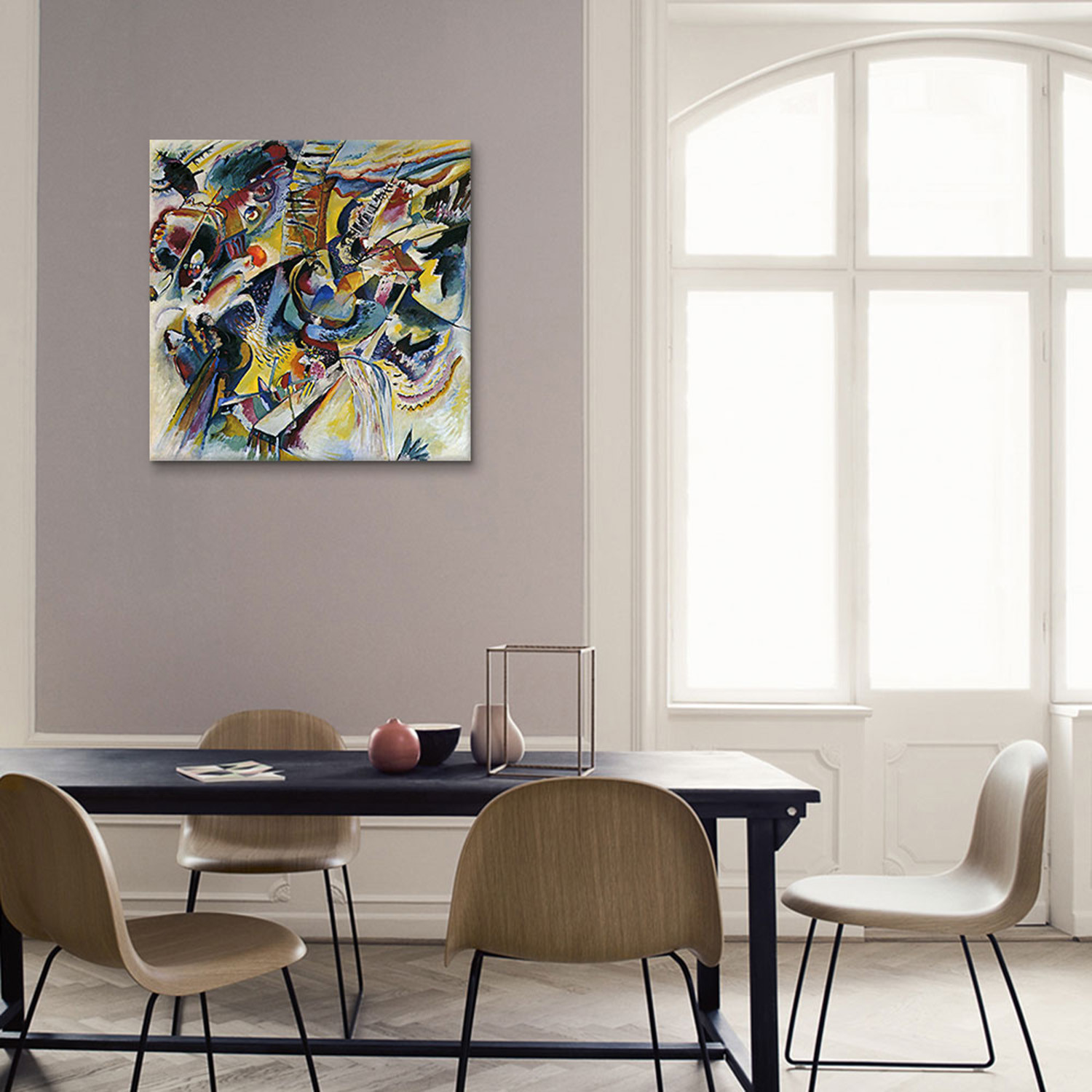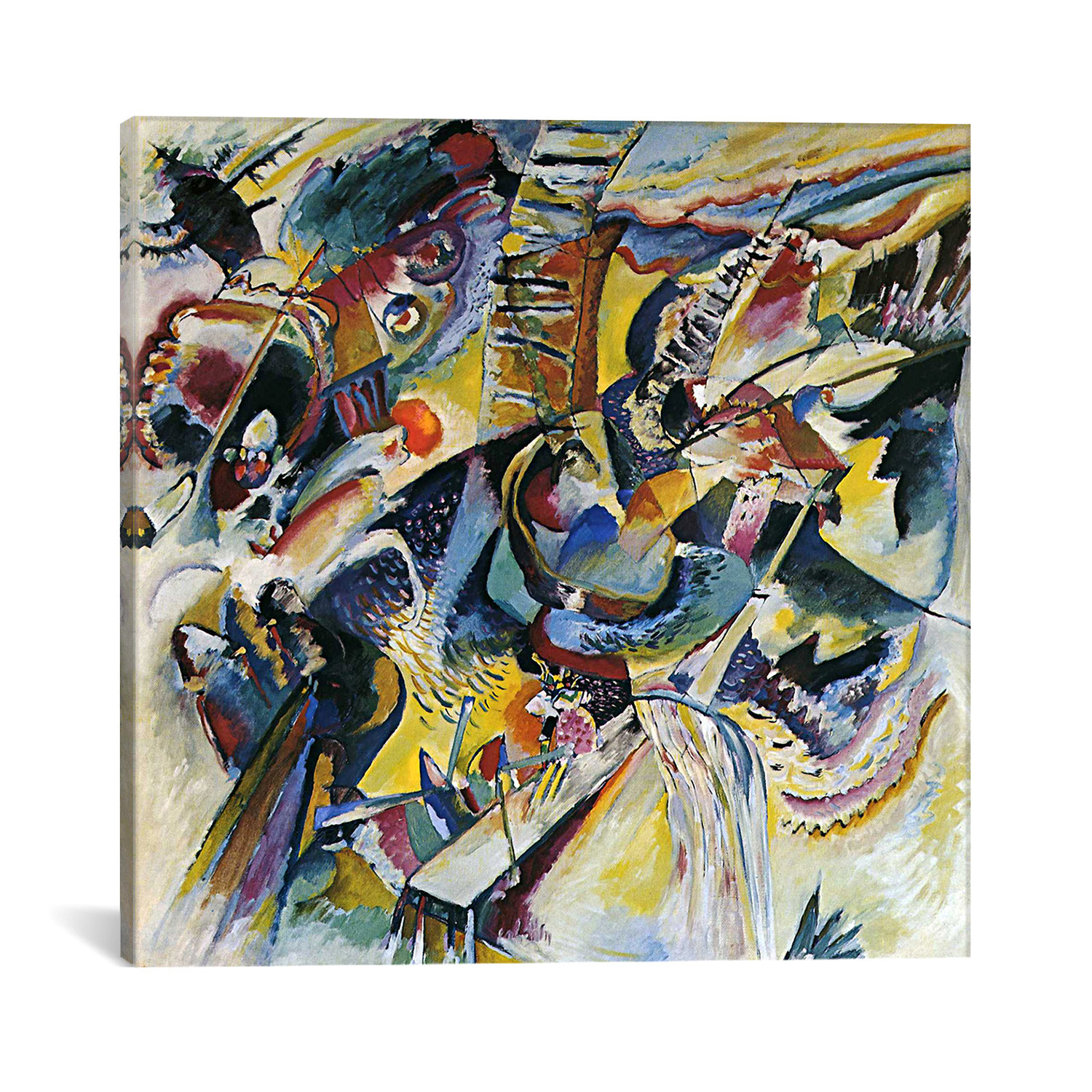 Wassily Kandinsky spearheaded the Abstract movement with his belief that colors have inherent qualities and movements, and that these colors can be used in lines and shapes to convey feelings outside of representational art. Faithfully reproduced on museum-quality cotton canvas, this legendary work of modern art is now available for you to to keep. Hang it anywhere that could use a kick of life and color, and keep a little reflection of history and creativity in your home.