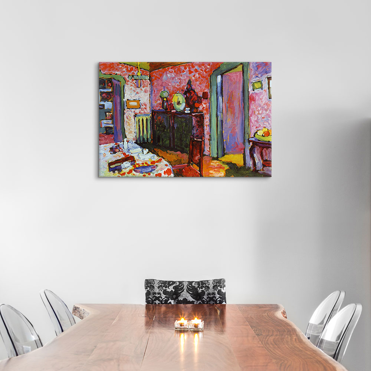 Wassily Kandinsky spearheaded the Abstract movement with his belief that colors have inherent qualities and movements, and that these colors can be used in lines and shapes to convey feelings outside of representational art. Faithfully reproduced on museum-quality cotton canvas, this legendary work of modern art is now available for you to to keep. Hang it anywhere that could use a kick of life and color, and keep a little reflection of history and creativity in your home.