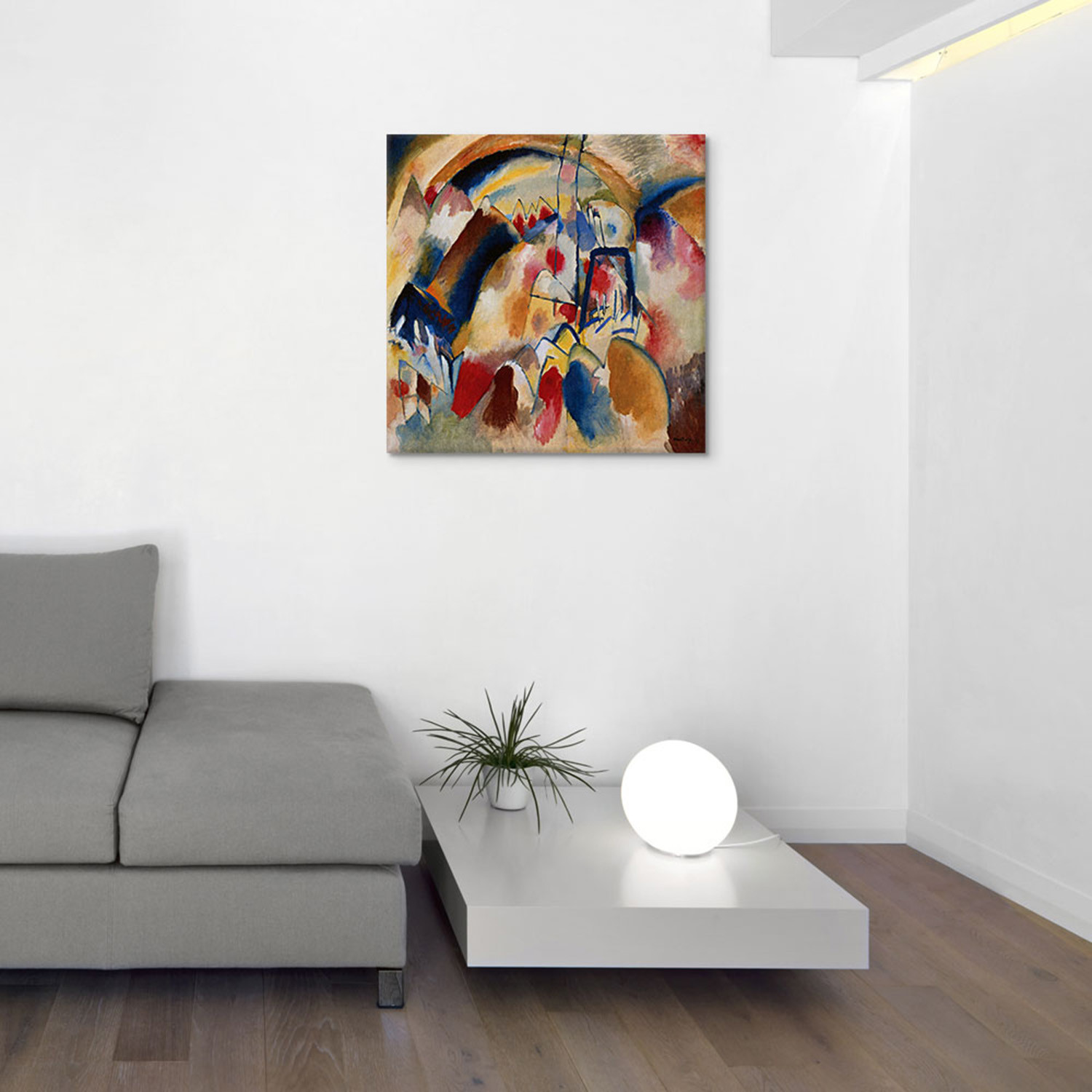 Wassily Kandinsky spearheaded the Abstract movement with his belief that colors have inherent qualities and movements, and that these colors can be used in lines and shapes to convey feelings outside of representational art. Faithfully reproduced on museum-quality cotton canvas, this legendary work of modern art is now available for you to to keep. Hang it anywhere that could use a kick of life and color, and keep a little reflection of history and creativity in your home.