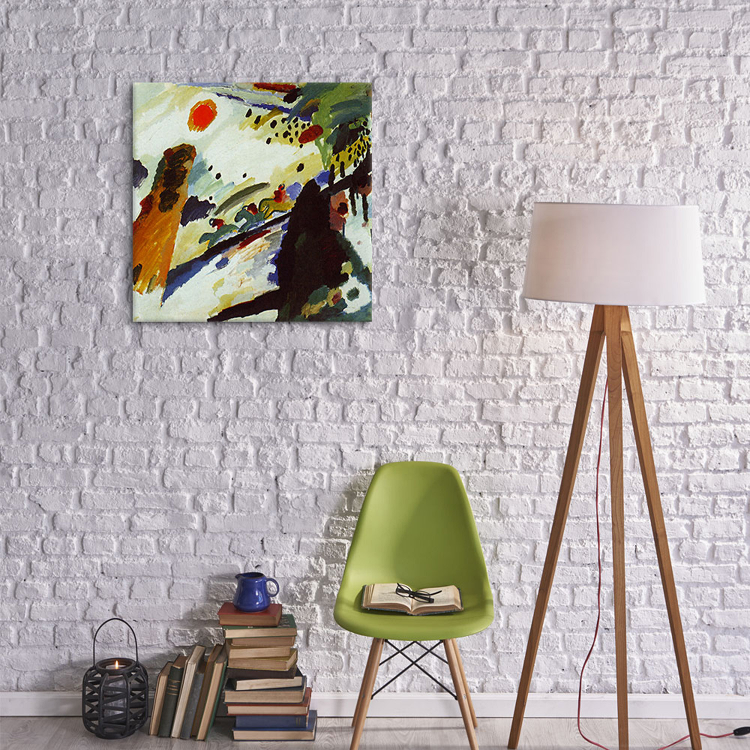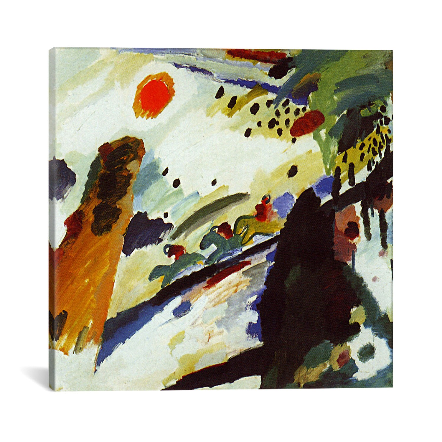 Wassily Kandinsky spearheaded the Abstract movement with his belief that colors have inherent qualities and movements, and that these colors can be used in lines and shapes to convey feelings outside of representational art. Faithfully reproduced on museum-quality cotton canvas, this legendary work of modern art is now available for you to to keep. Hang it anywhere that could use a kick of life and color, and keep a little reflection of history and creativity in your home.