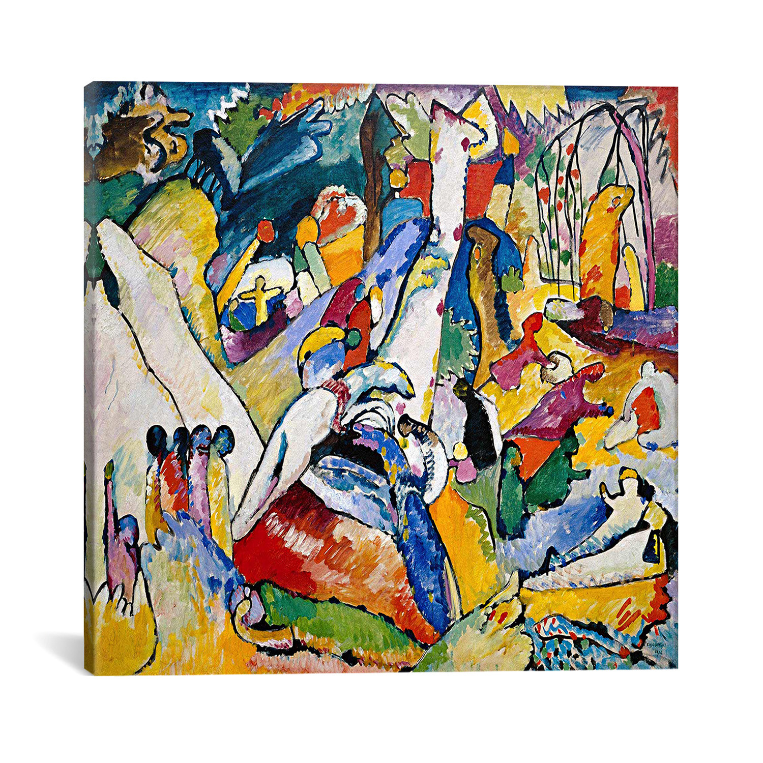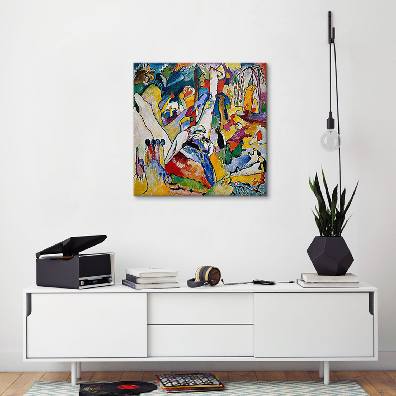 Wassily Kandinsky spearheaded the Abstract movement with his belief that colors have inherent qualities and movements, and that these colors can be used in lines and shapes to convey feelings outside of representational art. Faithfully reproduced on museum-quality cotton canvas, this legendary work of modern art is now available for you to to keep. Hang it anywhere that could use a kick of life and color, and keep a little reflection of history and creativity in your home.