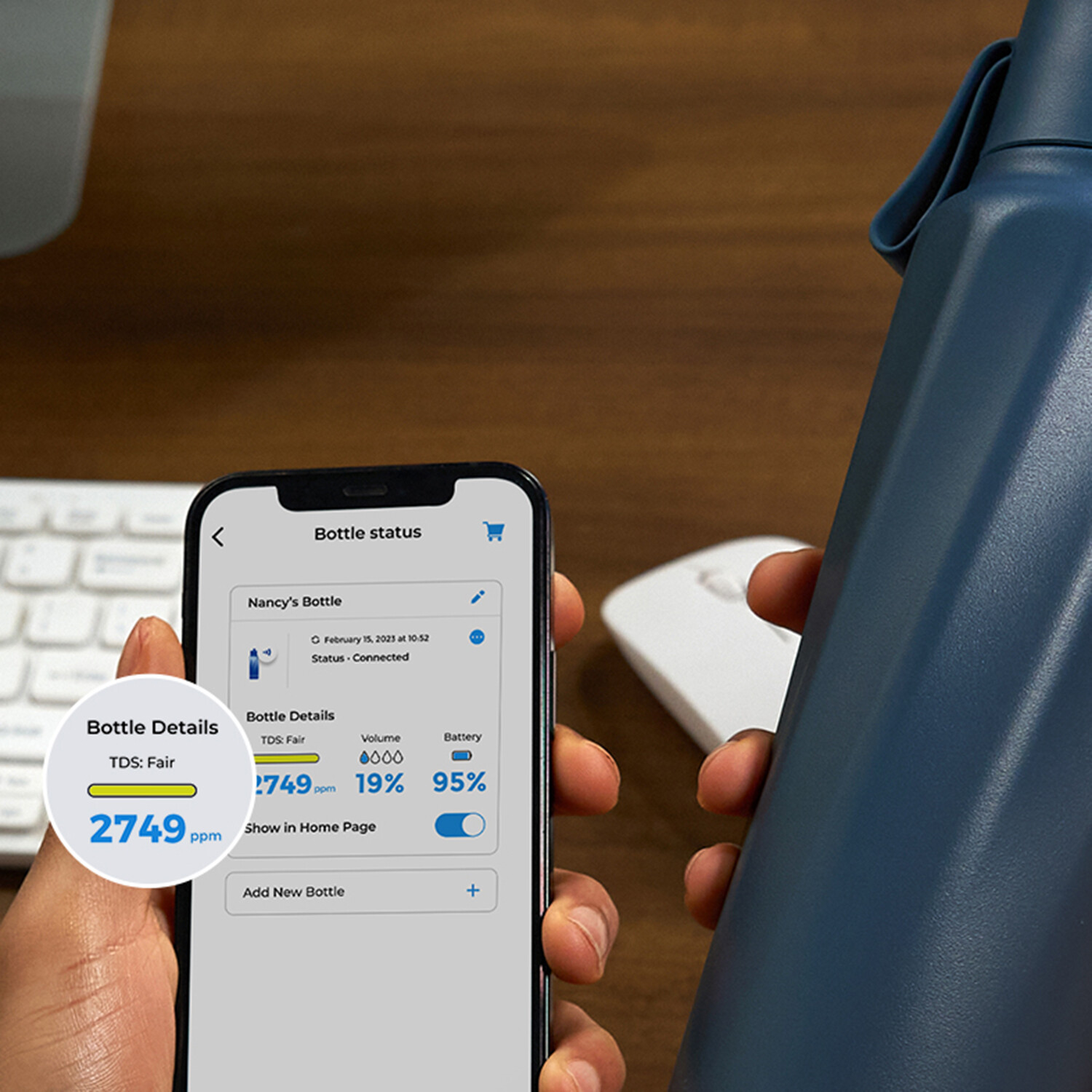 No need to guess or log manual entries. The sensor inside WaterH automatically tracks your exact level of hydration = a subtle reminder so you stay hydrated all day. Customize reminder preference and frequency in the WaterH app. WaterH is equipped with a water quality sensor that measures the TDS (Total Dissolved Solids) in your drinking water.