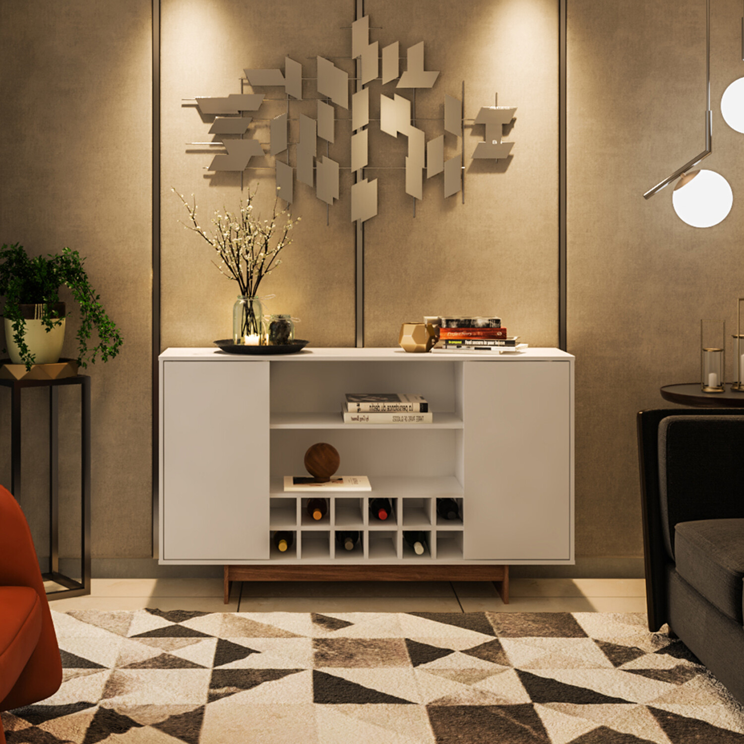 Its modern yet timeless style will complement any space, and can even double as a TV stand or modern media unit. The double door cabinet opens to reveal 4 concealed storage shelves, while the middle features 2 tier open shelves and a 12-bottle wine rack.Whether in the kitchen, living room, or dining room, the sophisticated look of this console will add unique appeal to your home decor.