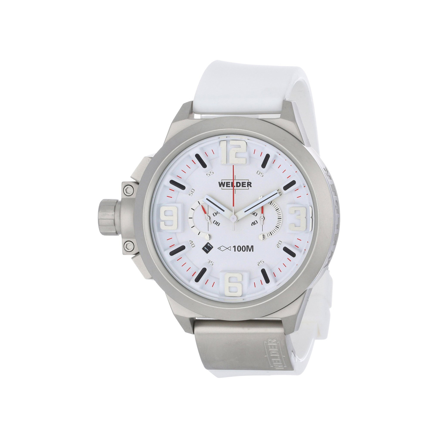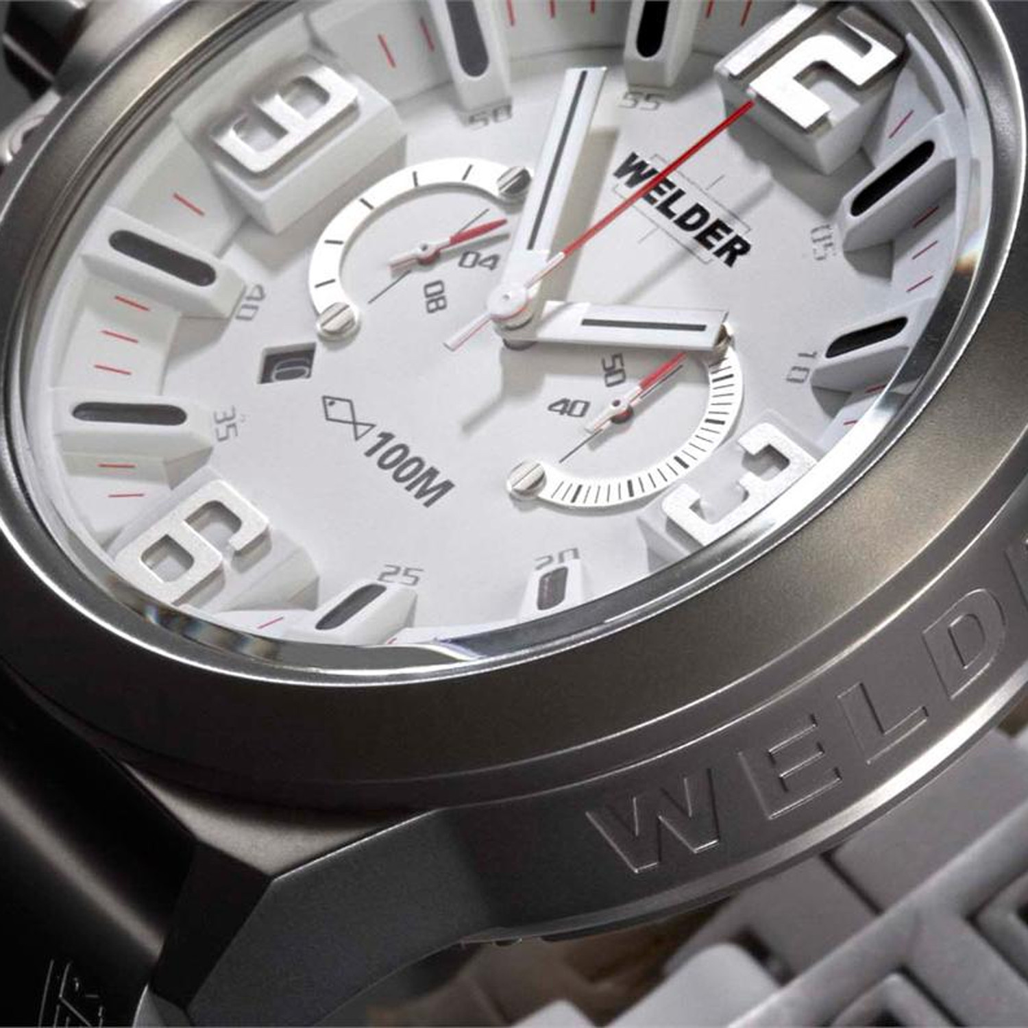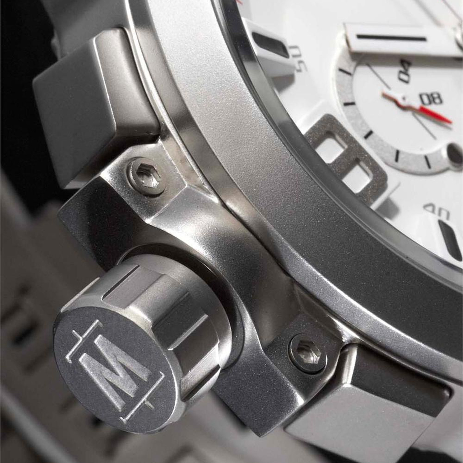 This oversized watch is a refreshingly bold statement. The large 50mm case features serious hardware, visually paralleled by the contrast of the modern indices and numerals on the face. The sleek rubber strap is minimal and unobtrusive, letting this timepiece's oversized case design steal the show.