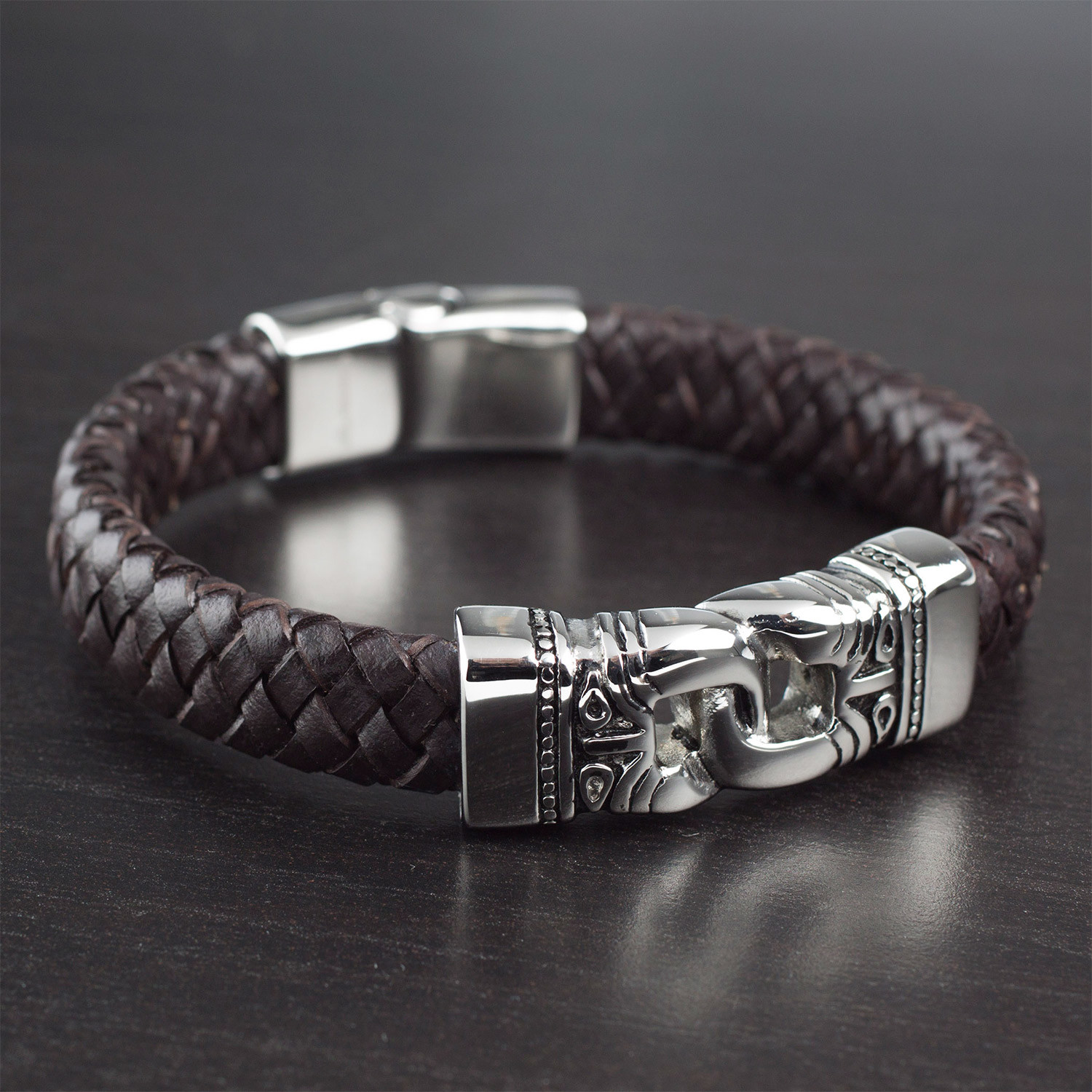 Crafted of stainless steel this stylish bracelet will give your outfit an unexpected edgy appeal. The brown leather has a high polished finish, and features an interlocking ID plate design that secures with a magnetic clasp for a sleek and masculine look.