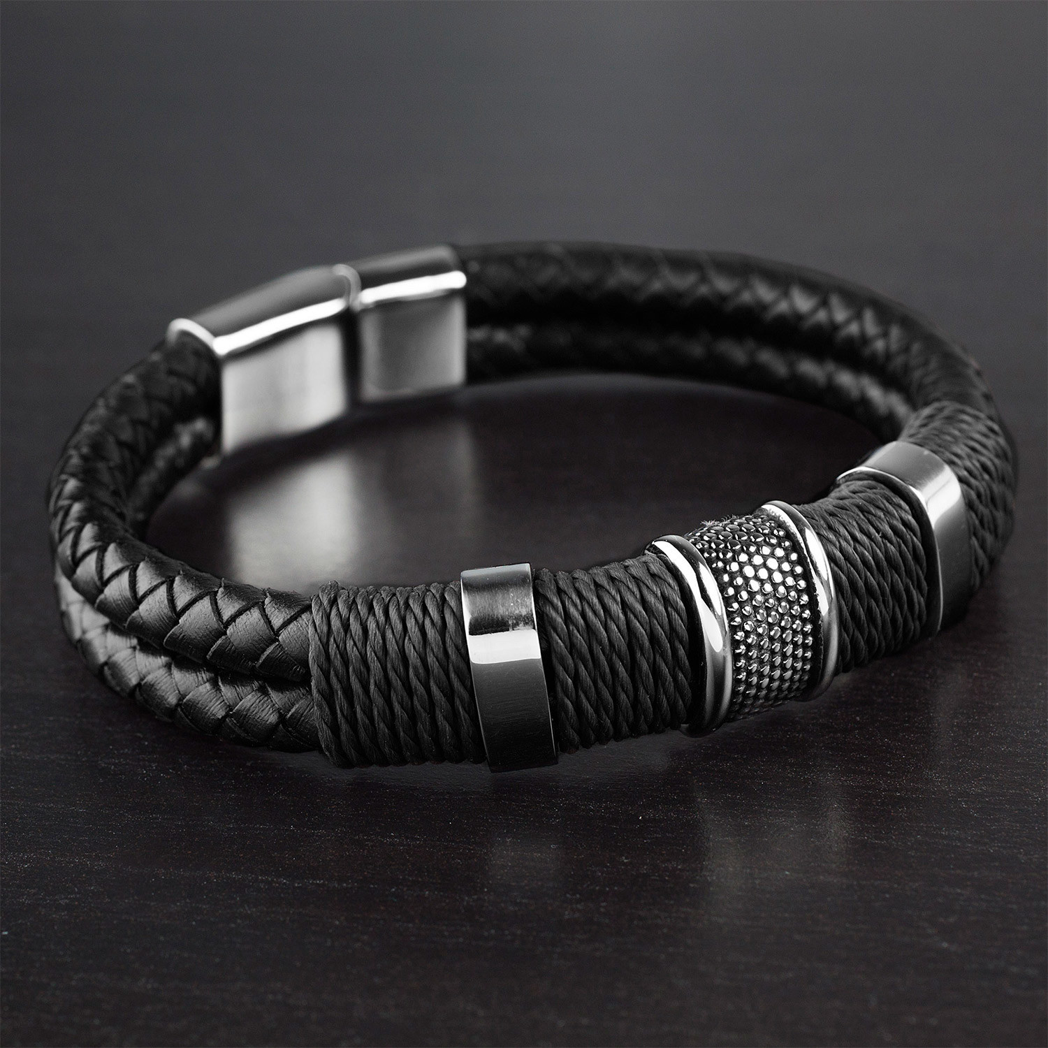 Stylish and uniquely rugged, this black leather bracelet features two woven leather rows, tightly wound by twine, and three stainless steel beads. The bracelet encloses with a magnetic clasp, and is ideal to wear for any occasion.
