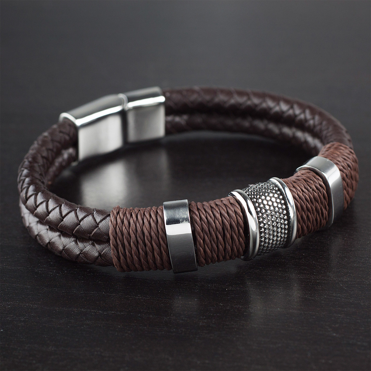 Stylish and uniquely rugged, this brown leather bracelet features two woven leather rows, tightly wound by twine, and three stainless steel beads. The bracelet closes with a sleek magnetic clasp, and is perfect for any occasion.