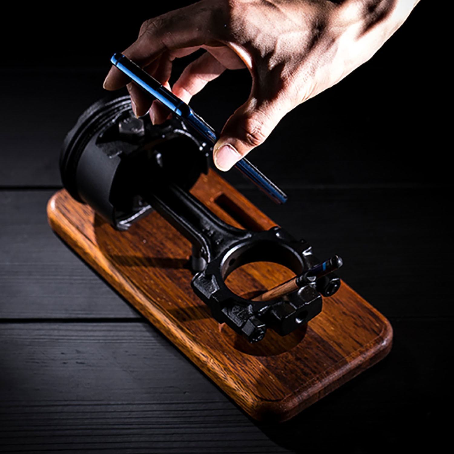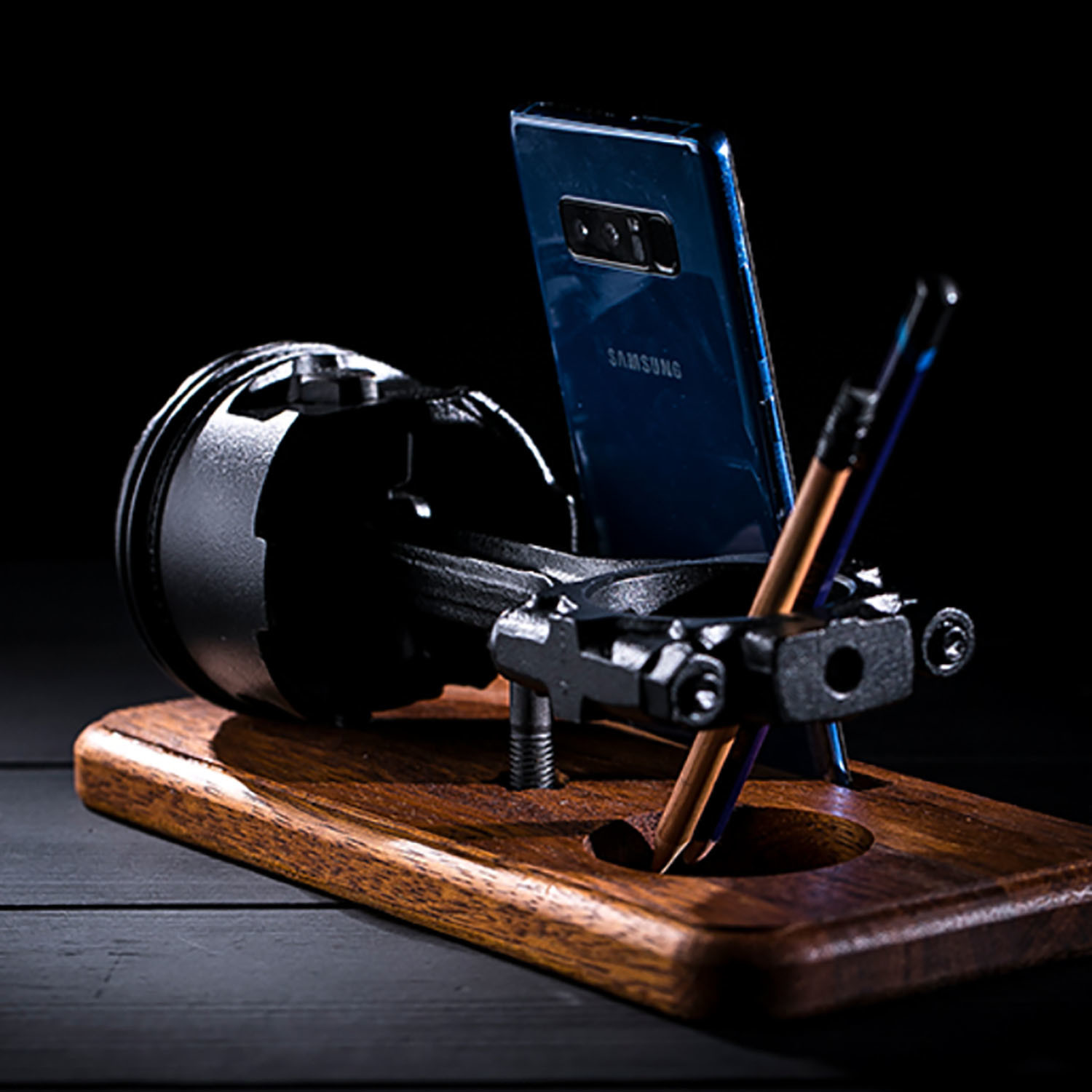 Wheellife gives a second life to beloved old cars. Each innovative design is handcrafted from genuine upcycled car parts to create unique masterpieces. With the upcycled piston installed horizontally on the wooden base, pens can be held in the piston ring and a smartphone fits into the groove on the wooden base.