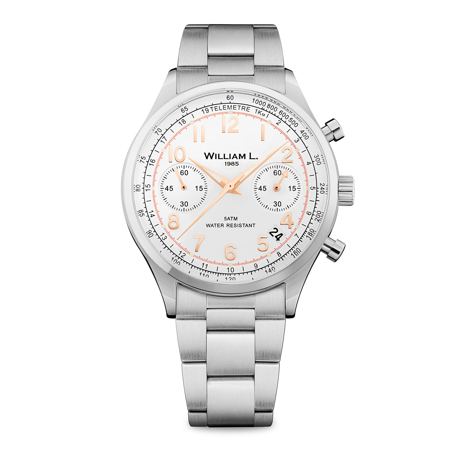With vintage flair and timeless style, the William L. 1985 Chronograph sets itself apart from other contemporary timepieces. Balanced and refined, it features retro pushers and classic dauphine hands.