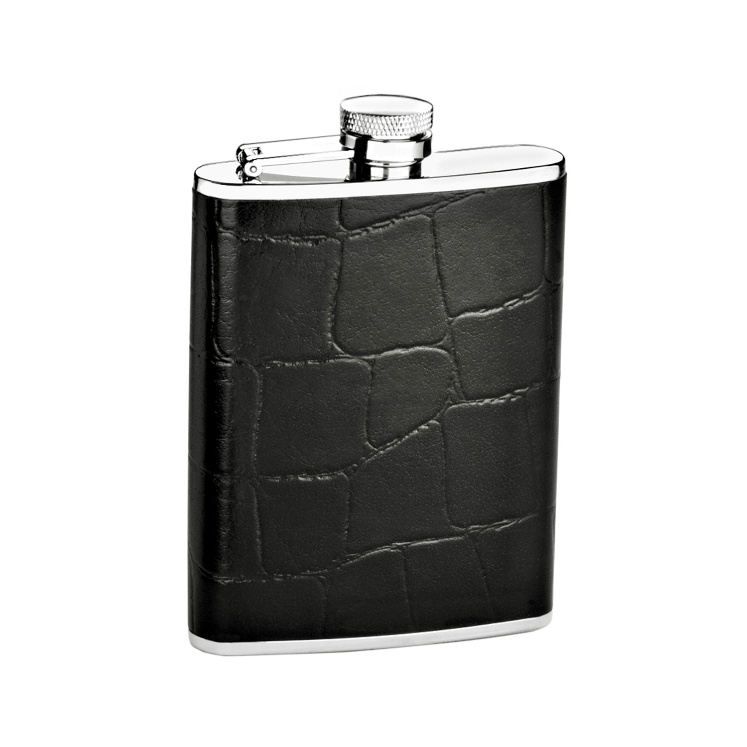 Get classic with this stylish flask. It holds six fluid ounces and looks sharp with a stainless steel foundation that's been wrapped in genuine leather with an embossed crocodile pattern. This portable piece has a captive top and fits easily in your bag.