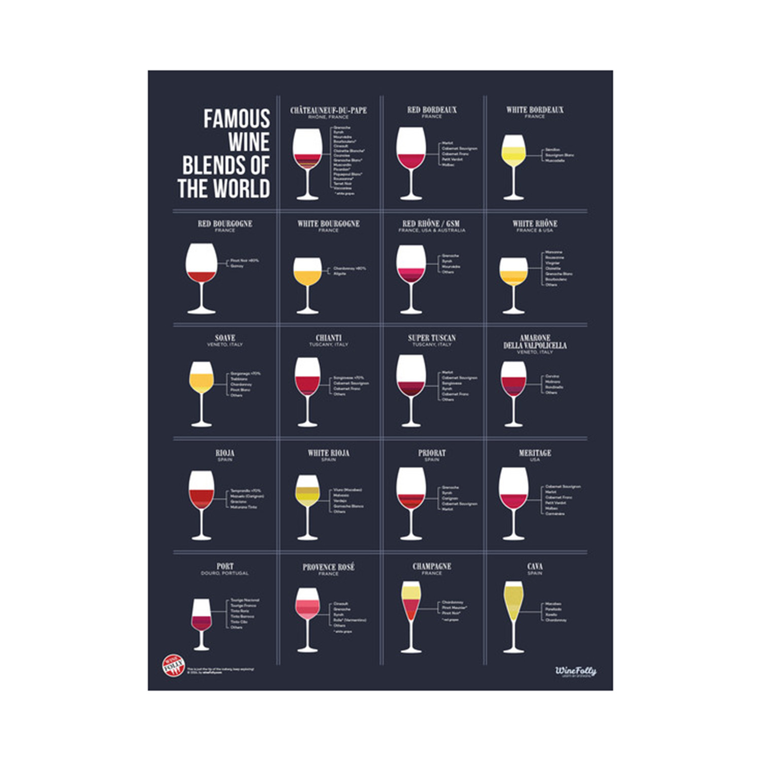 This elegant chart shows what's inside famous wine blends of the world. The poster will be your inspiration to try all nineteen variations, and is made with colorfast inks for a vibrant look.