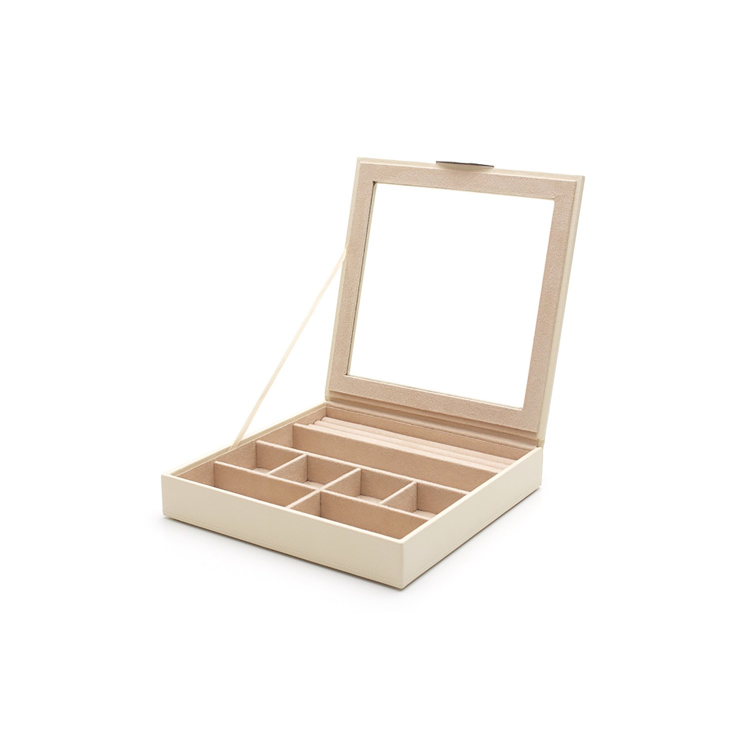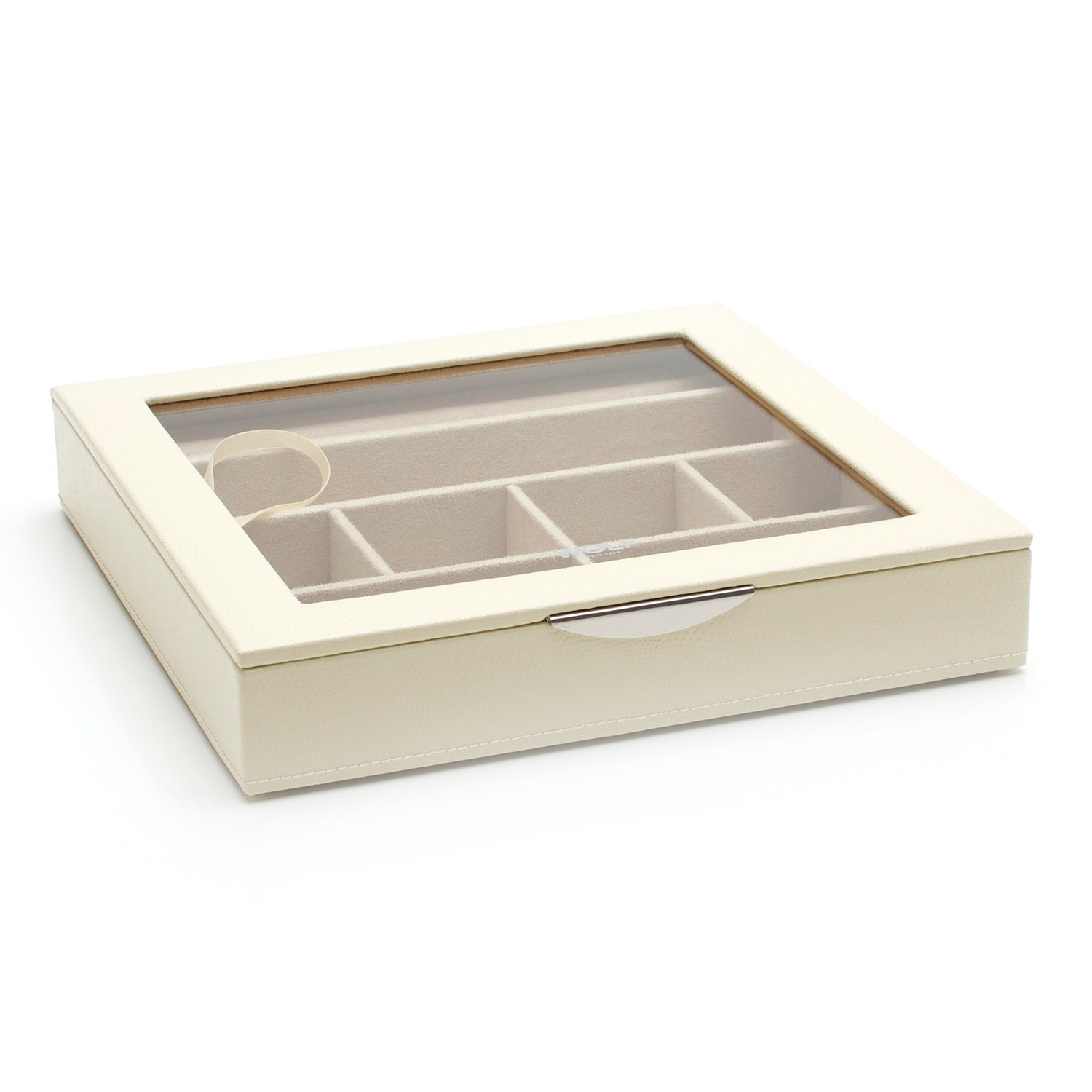 A delicately constructed leather jewelry tray, the London Tray with Glass Lid represents a city synonymous with sophistication. Includes embossed leather, glass lid, seven jewelry compartments, three ring rolls and LusterLoc allows the fabric lining the inside of your jewelry cases to absorb the hostile gases known to cause tarnishing. Under typical storage conditions, LusterLoc may prevent tarnishing for up to 35 years.