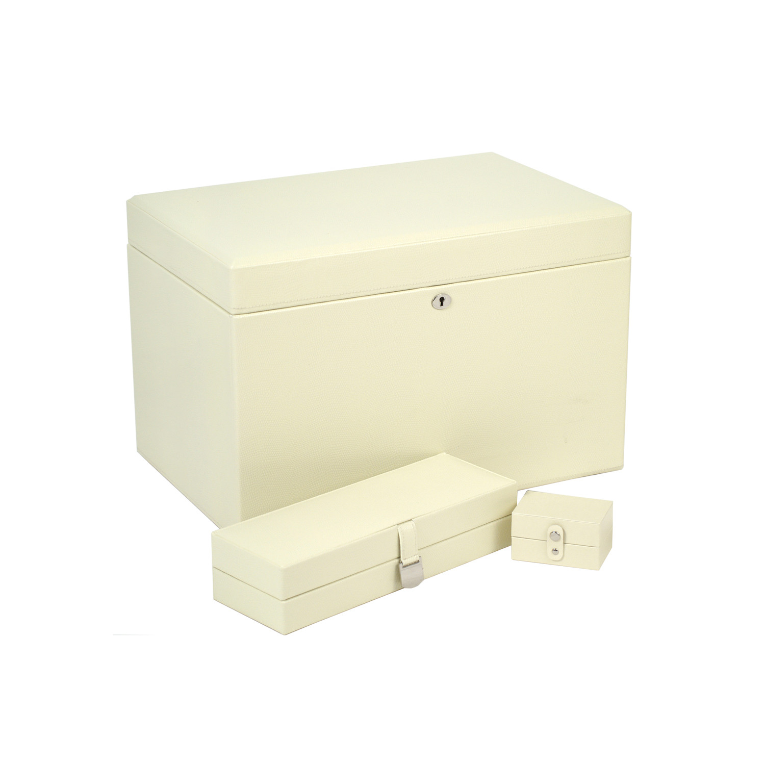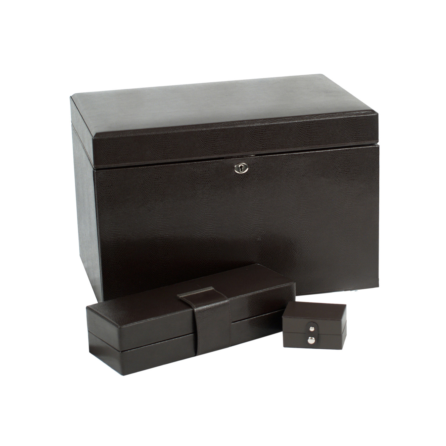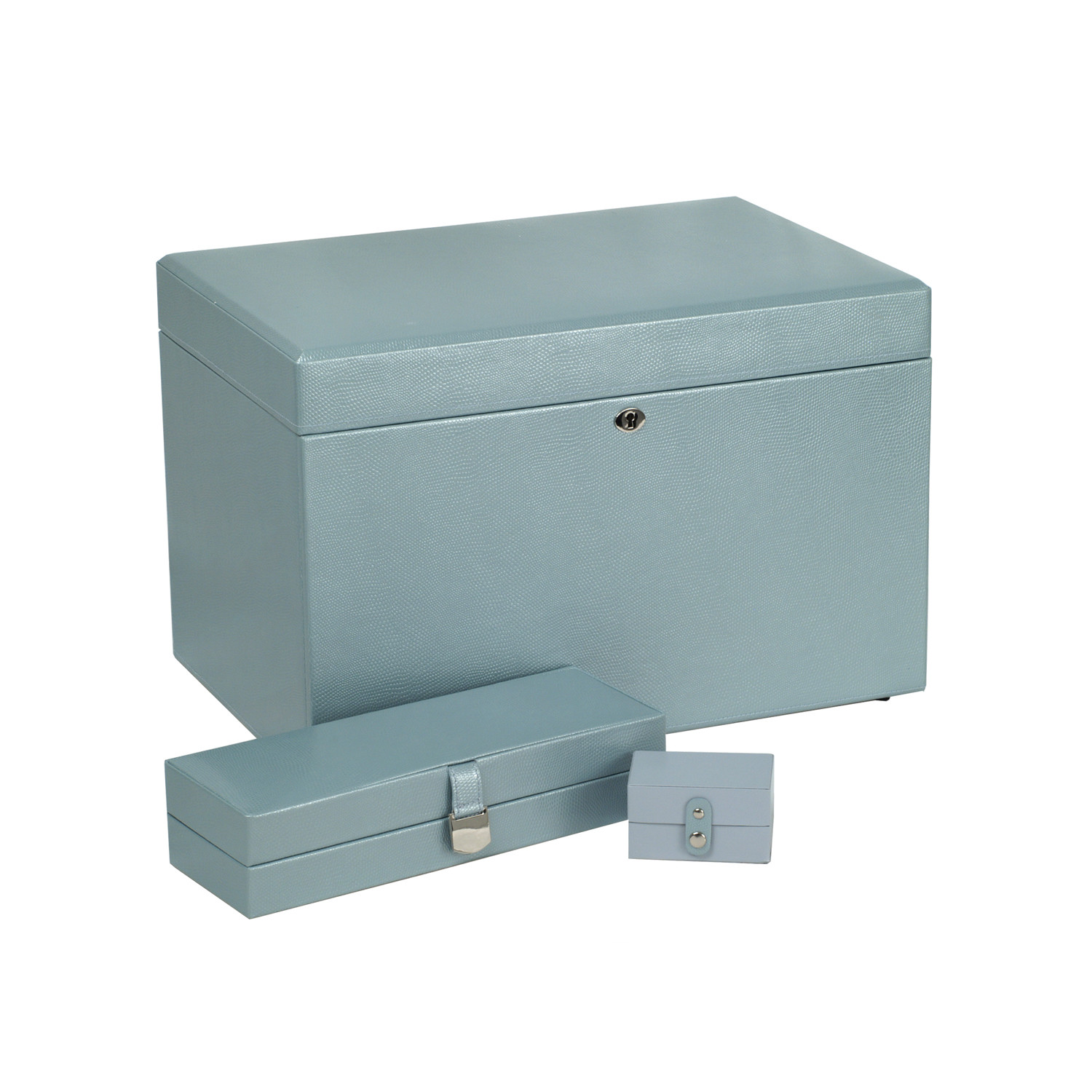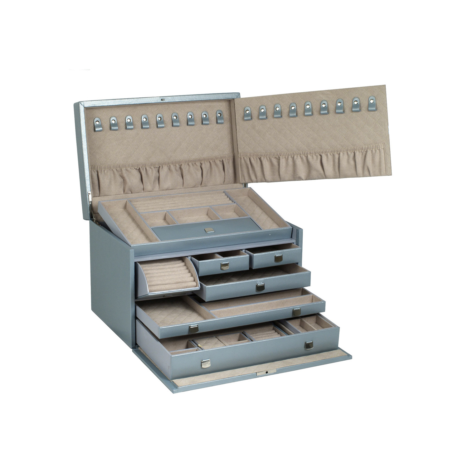 The London Collection represents a city synonymous with sophistication. A delicately constructed leather jewelry box, this piece includes embossed leather, a glass mirror, chrome fittings, a lock and key, 26 jewelry compartments, 9 ring rolls, 18 necklace compartments, and a separate travel case. The LusterLocâ„¢ even allows the fabric lining the inside of your jewelry cases to absorb the hostile gases known to cause tarnishing. Under typical storage conditions, LusterLocâ„¢ may prevent tarnishing for up to 35 years.