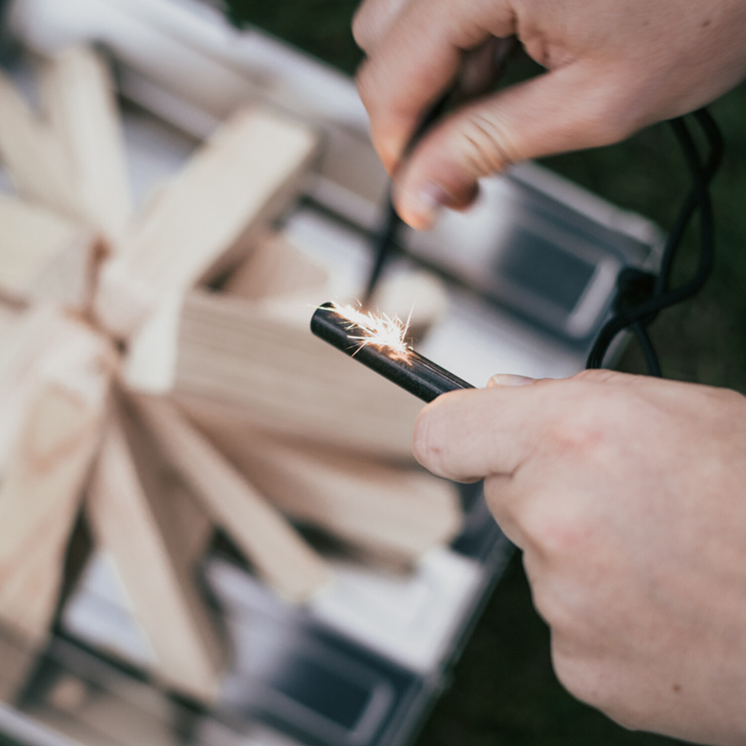 It strikes at all altitudes and even in wet conditions and is the perfect addition to your survival kits and bug-out bags. The steel striker's slightly curved designed allows it to fit against the ferro rod, making this Fire Set easy to pack up and stow away.