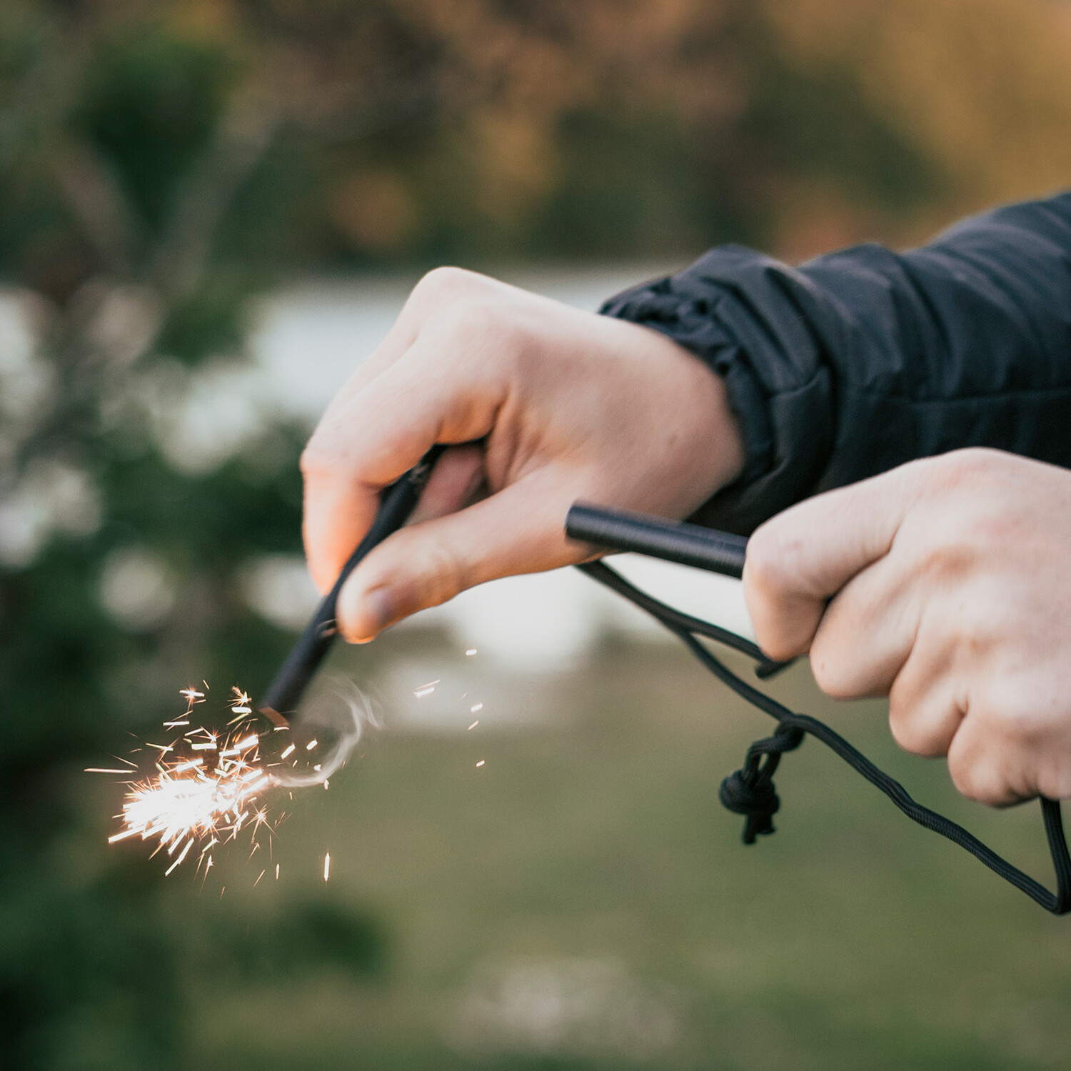 The 20,000 Strikes Fire Set delivers consistent sparks from the first strike to the last. The rod is 100% ferrocerium, so you can strike every last piece. Just scratch the black paint off the ferro rod, firmly press the edge of the striker against the ferro rod, and strike.