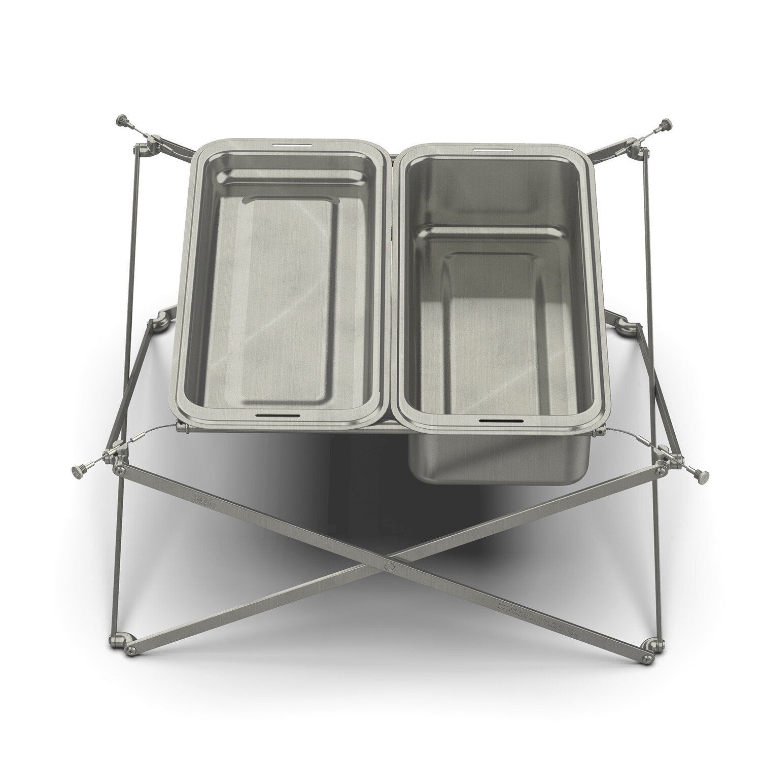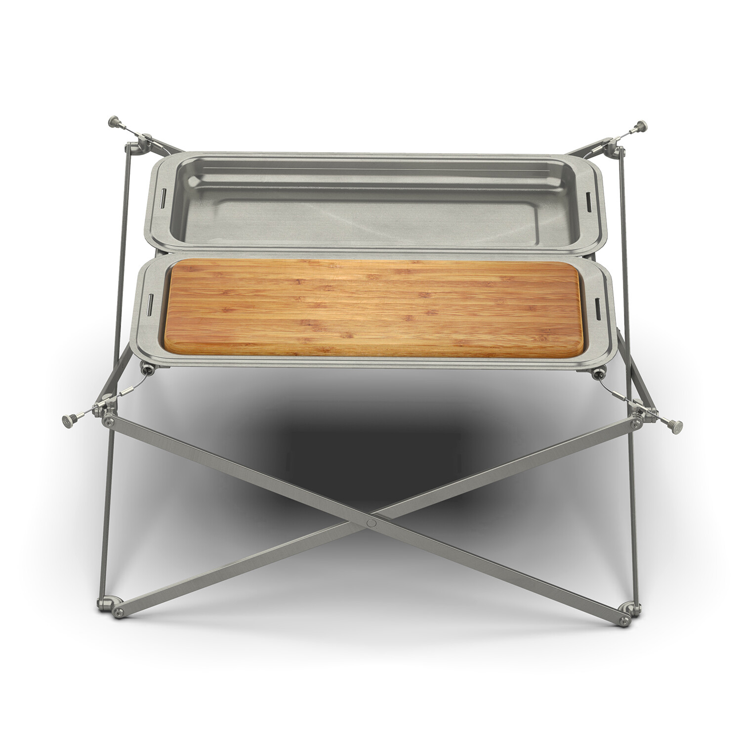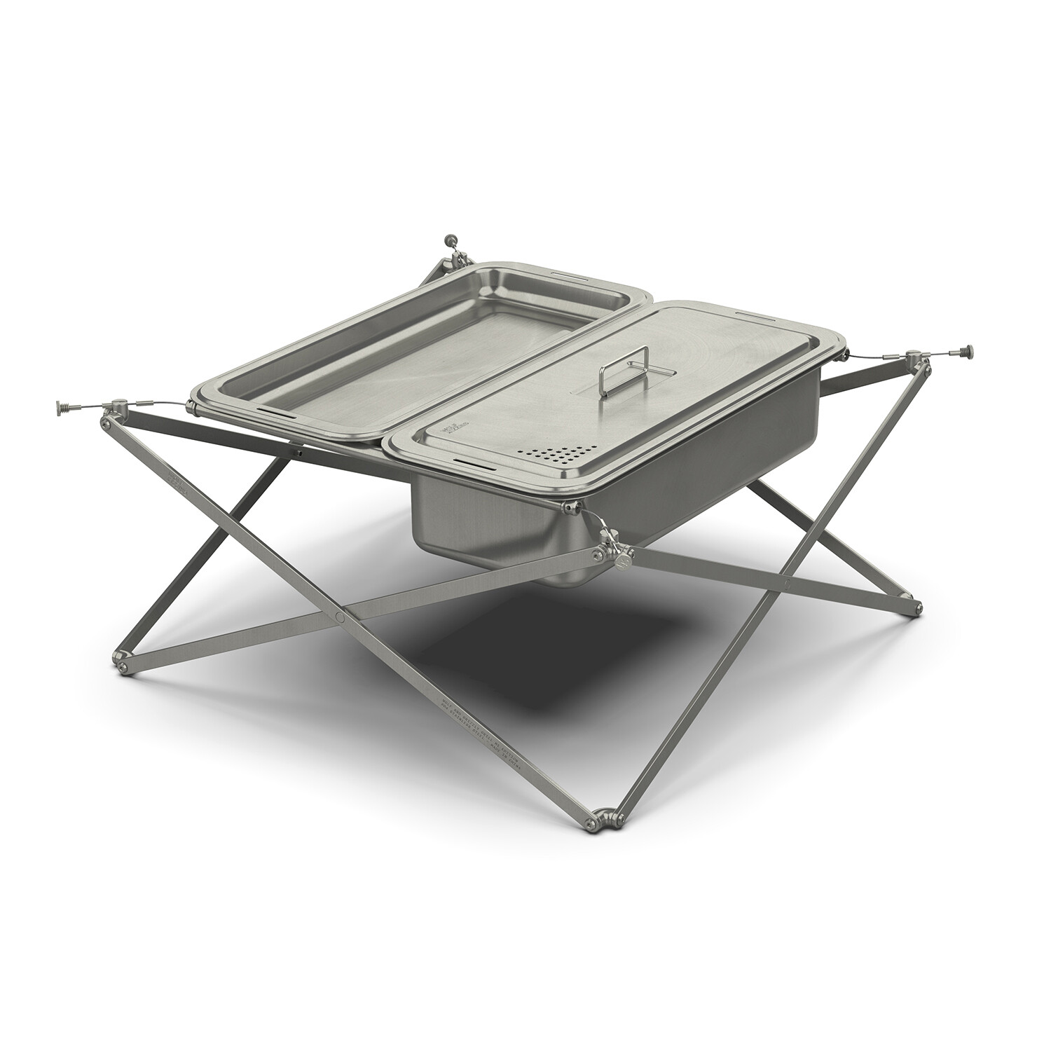 Connect the custom Rail System to the WG Grill frame and insert the cookware. Use the Pot Gripper to move things around from the hottest part of the fire to the cooler spots, without worry that items will accidentally slide or fall.