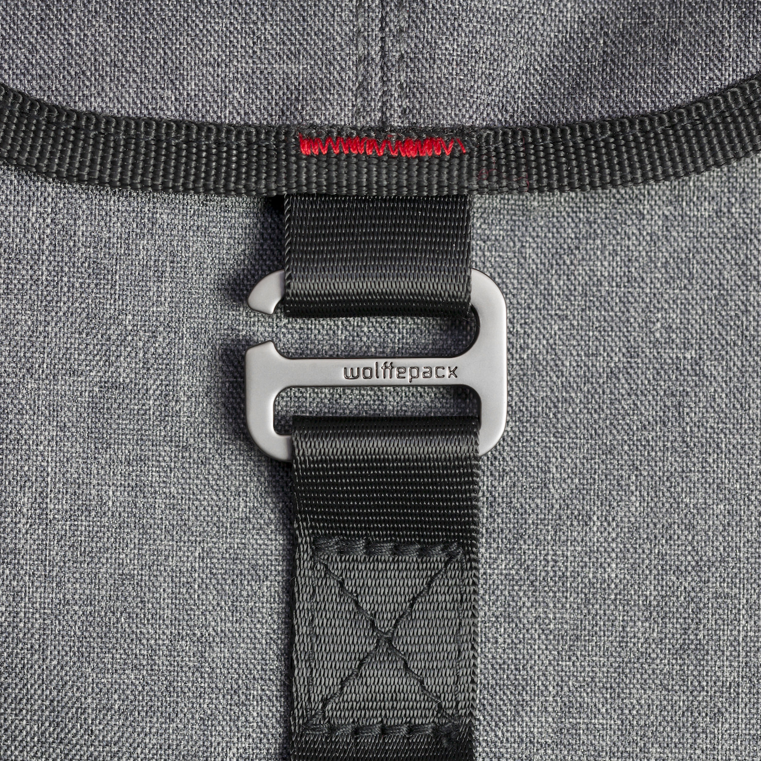 Waterproof rain cover: Ripstop nylon and branded with Wolffepack logo it tucks into custom pocket under the backpack.