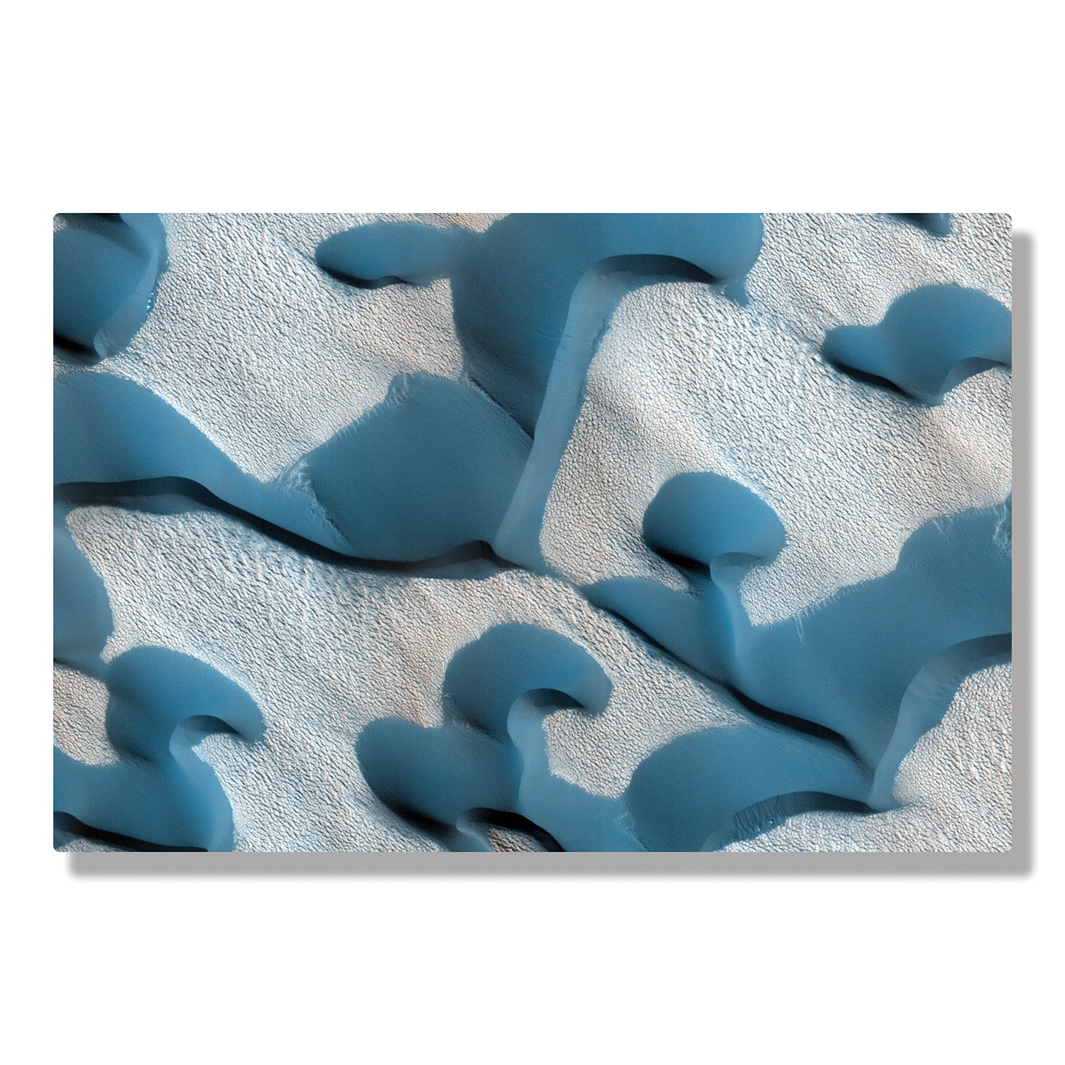 Enjoy the beauty and wonder of a new planet with this high-gloss aluminum Mars print. Each piece comes with an engraved panel on the back that describes details of the image being portrayed, including the exact coordinates, local mars time at the moment of capture, and the instrument used. Add it to your space for an otherworldly touch.